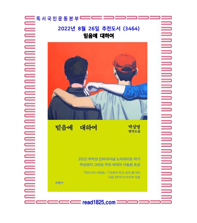 『대도시의 사랑법』 『1차원이 되고 싶어』를 잇는 ‘사랑 3부작’의 마지막 작품『믿음에 대하여』. 2022년 세계 3대 문학상 중 하나로 손꼽히는 부커상의 인터내셔널 부문 후보로 선정되어 화제를 불러일으킨 소설가 박상영의 신작 연작소설 『믿음에 대하여』가 출간되었다. 전작 『대도시의 사랑법』이 끊임없이 실패하면서도 사랑에 몸을 던지는 이십대의 뜨거운 나날을, 『1차원이 되고 싶어』가 가슴 저릿한 첫사랑의 동요와 말 못 할 비밀로 인한 상처를 회복해나가는 십대 시절을 그렸다면, 『믿음에 대하여』는 어느새 사회 초년생이 된 이들이 직장에서 분투하는 눈물겨운 모습을, 그리고 삶의 동반자와 안정적인 관계 지속을 꿈꾸는 삼십대의 생활상을 보여준다. 온전히 자신의 힘으로 스스로를 거두어야 하는, 일과 사랑을 모두 손에 쥐고 싶지만 그중 하나도 제대로 이루기 어려운 삼십대의 고충을 특유의 생생한 입담으로 전하는 이번 작품은 박상영 ‘사랑 3부작’의 최종장이자 새로운 페이즈를 알리는 신호탄이라고 할 수 있다.