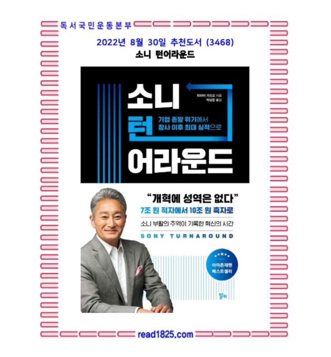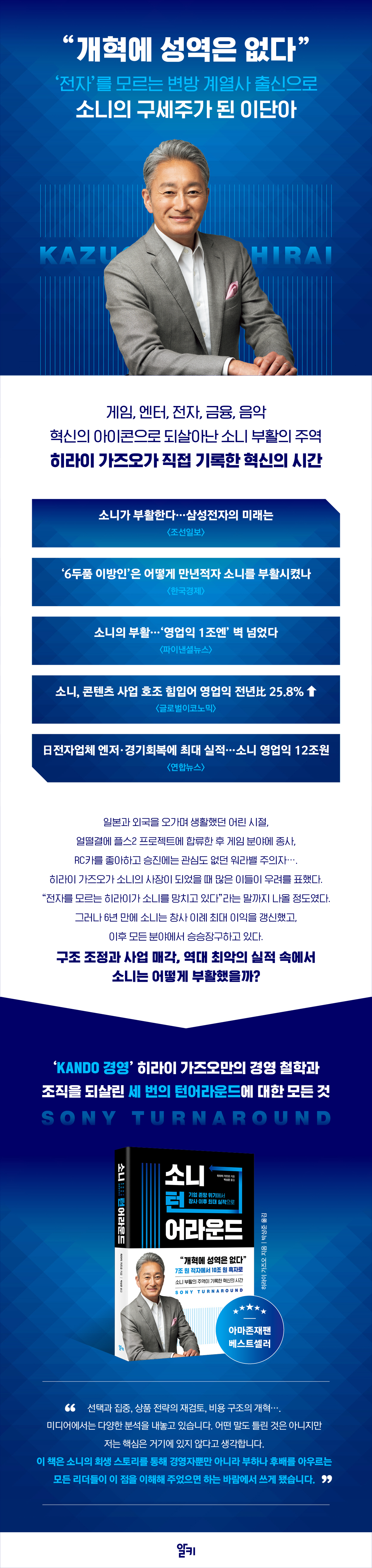 턴어라운드는 침체된 조직을 생동감 넘치는 조직으로 급속히 바꾸는 개혁을 말한다. 과거 후발 주자에 밀려 존폐 위기에 빠졌었던 소니는 오늘날 세계를 호령하는 기업으로 ‘턴어라운드’했다. 사고 싶어도 없어서 못 사는 플레이스테이션5, 세계 최정상 뮤지션들의 소속사이자 음원사인 소니뮤직, 일본 역대 흥행기록을 모두 갈아 치운 애니메이션 〈귀멸의 칼날〉은 과거 ‘전자 왕국’이었던 소니가 현재 어떤 회사로 탈바꿈했는지 여실히 보여준다. 전체 매출의 절반 이상을 엔터테인먼트에서 벌어들이지만 여전히 ‘이미지 센서’ 등 특정 분야에 있어선 압도적 기술을 보유한 ‘기술의 소니’이기도 하다.