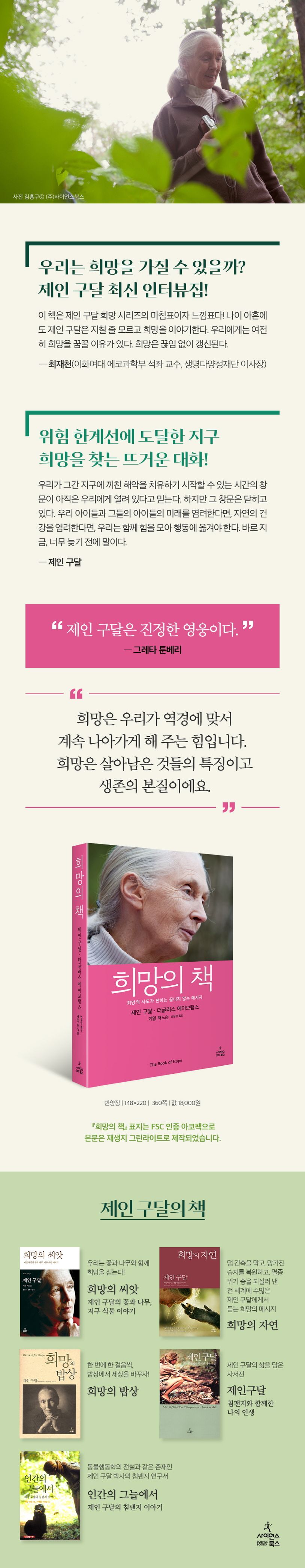 인간이 지구에서 개성과 생각과 감정을 지닌 유일한 동물이 아님을, 우리가 놀라운 동물의 왕국에서 떼려야 뗄 수 없는 일부분임을 알고 있던 제인 구달의 연구 방식은 전통적인 과학자들과는 달랐지만 결국 오늘날 인간과 동물의 관계를 변화시키는 데 핵심적인 역할을 해냈다. 1986년, 의학 연구소의 침팬지 처우 개선을 위해 나선 제인 구달은 이후 쉼 없이 새로운 강단에 서고 청중의 손을 잡아 왔다. 제인 구달이 자연을 연구하면서 배웠던 희망의 이야기를 공유한 이 책은 우리 모두의 행동이 다른 이에게 영감을 줄 것이라고 강조한다. 희망은 전염된다.