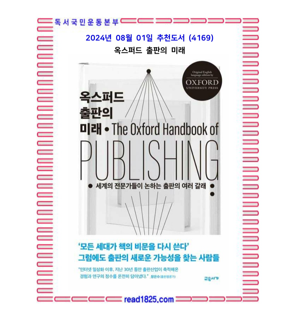 전 민음사 대표이사인 출판평론가 장은수가 이 책의 ‘추천의 글’ 「다시, 출판의 미래를 생각하면서」를 썼다. 이 글은 『옥스퍼드 출판의 미래』를 요약하며 출판의 속성을 분석한다. 출판을 문화적 속성과 산업적 속성으로 나누며 무엇보다 출판이 인류 정신문화의 정수인 책을 만든다고 이야기한다. 이 글에 따르면 독자는 단지 정보나 지식을 얻고자 책을 읽는 게 아니다. 그들은 자신의 정체성을 이루고자 책을 읽는다. 책으로 문화적 아우라(aura)를 함께 향유하고 체화하는 것이다.