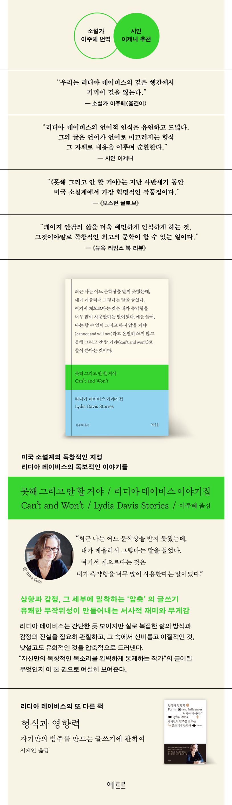 리디아 데이비스의 독보적인 이야기를 이주혜 소설가의 번역으로 만난다. 작가의 관점과 작품의 특성을 면밀히 파악한 후 의미를 섬세하게 옮겨낸 그의 작업이 책의 출간을 더욱 특별하게 만든다. 또한 리디아 데이비스 작품에 대한 이제니 시인의 깊은 이해와 애정이 담긴 ‘추천의 말’은 문학 독자들이 데이비스의 작품에 다가가는 데 큰 도움이 될 것이다.