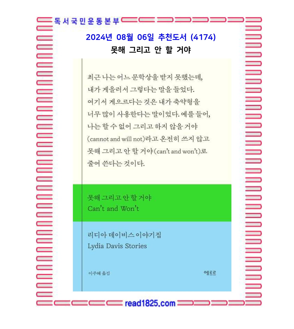 리디아 데이비스는 덜 전통적인 형식, 그중에서도 특히 ‘짧은 글’에 조예가 깊다. 그는 상황과 감정을 압축하고 축약하여 단 하나의 진실을 확대시켜 들여다보게끔 하고, 글 안에서는 어떠한 전개도 가능하다는 걸 몸소 보여준다. 이 책의 표제작인 〈못해 그리고 안 할 거야〉는 그의 이런 글쓰기 특징을 자조적으로 위트 있게 풀어낸 글이다. 글을 쓸 때 ‘축약형’을 너무 많이 써서 문학상 심사위원들에게 게으르다는 평을 받았고 그래서 상을 받지 못했다는 내용인데, 공교롭게도 그렇게 축약해 쓴 단어가 ‘못해’ 그리고 ‘안 할 거야’다. 이 짧고 압축적인 몇 문장 속에서 전통적인 글쓰기에 대한 그의 재치 있는 반항 혹은 어떤 결의 등이 느껴져 흥미롭다.
