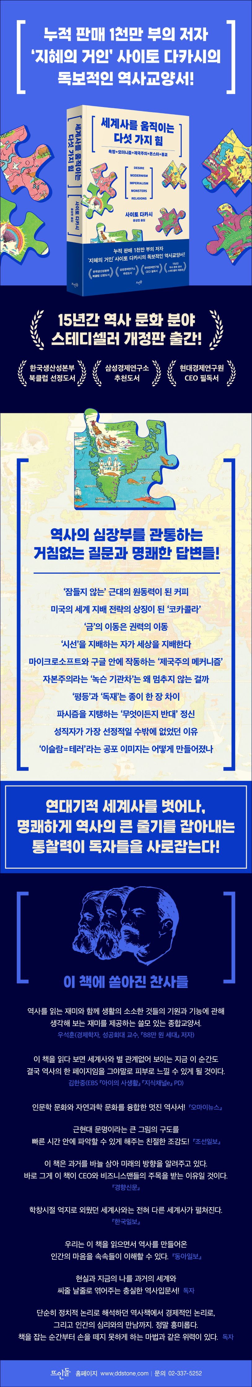 출간 당시, 10개월 만에 10만 부가 판매되며 유수 기업과 경제 단체의 필독서 선정은 물론, 오랫동안 전국 서점의 역사 문화 분야 베스트셀러 자리를 지켰던 사이토 다카시의 『세계사를 움직이는 다섯 가지 힘』이 15년 만에 새로운 디자인의 개정판으로 돌아왔다.