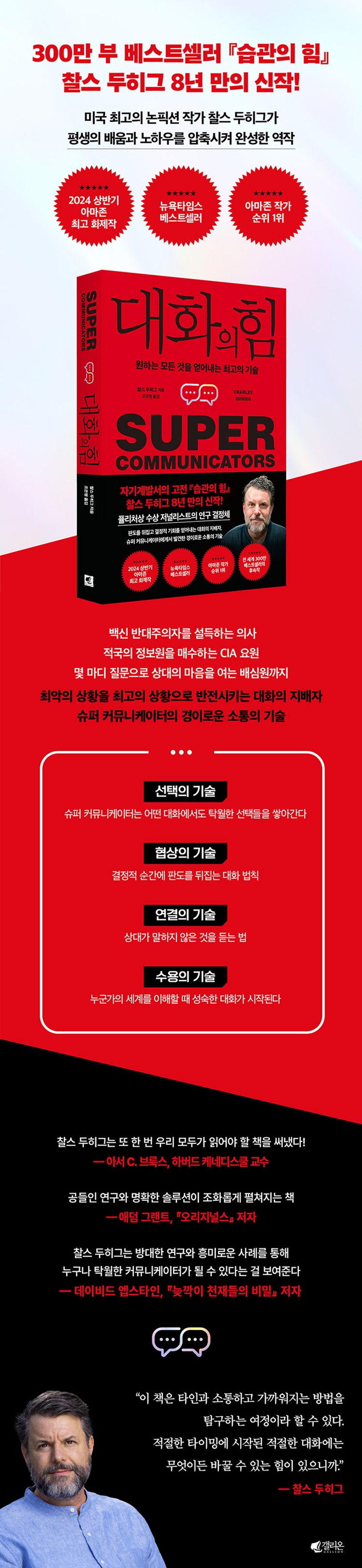 이 책을 끝맺는 저자의 에필로그가 인상적이다. 찰스 두히그는 1년 동안 망쳤던 대화를 기억나는 대로 적어가면서 반성한다. 왜 상대의 말을 듣는 것이 그렇게 힘들었을까? 왜 성급하게 방어 자세를 취하고, 상대방이 나와 감정을 나누려는 것을 알면서도 모르는 척했을까? 왜 그렇게 많이 말하고 적게 들었을까? 그는 이 책을 위해 오랫동안 수많은 사람을 취재하며 큰 깨달음을 얻는다. 우리 모두가 원하는 것은 결국 상대와 가까워지길 ‘원한다는 것’이다. 우리는 이해하길 원하고, 깊은 대화를 나누길 원한다. 어렵고 두려워서 그냥 피해버리는 게 더 쉽더라도 말이다. 우리가 갈망하는 교감을 만족시킬 대화의 기술은 분명 존재한다. 누군가와 진실되고 의미 있는 관계가 된다는 것은 인생에서 가장 중요한 일이기 때문이다. 찰스 두히그는 단절된 시대를 살아가는 지금 우리에게 가장 중요한 질문이 무엇인지 아는 사람이다. 8년 만에 깊은 깨달음으로 돌아온 찰스 두히그는 우리를 더없이 흥미롭고 시의적절한 대화의 세계로 독자들을 초대한다.