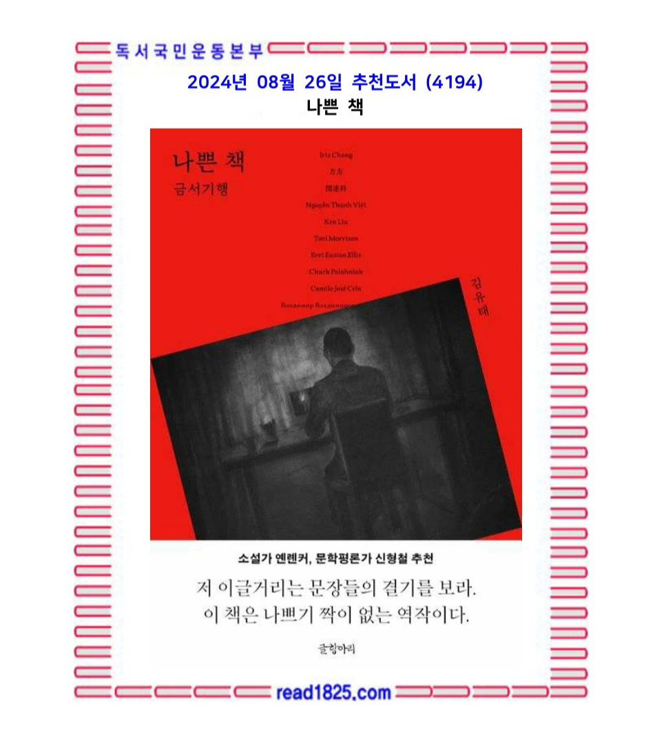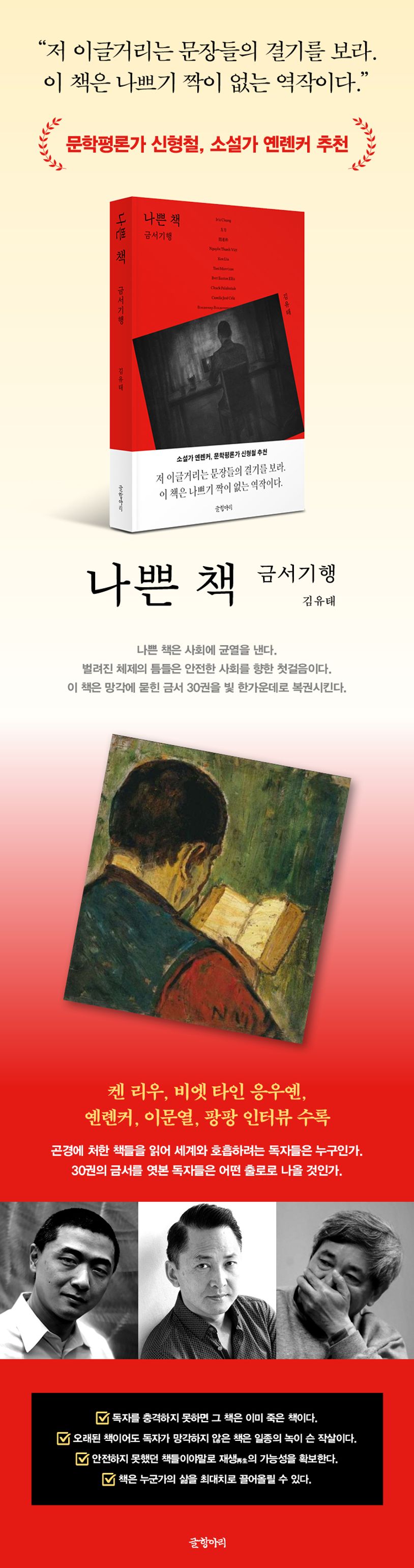 이 책은 ‘나쁜 책’을 이렇게 정의한다. “날것처럼 세상을 투영하고 반영하는 것이 거부된 세상에서 무형의 마지노선인 ‘윤리’를 고민하며 그것을 회복하기 위한 선의로 가득한 책.” 저자는 이 선의로 가득한 책들을 구출하기 위해 『나쁜 책』을 썼다.