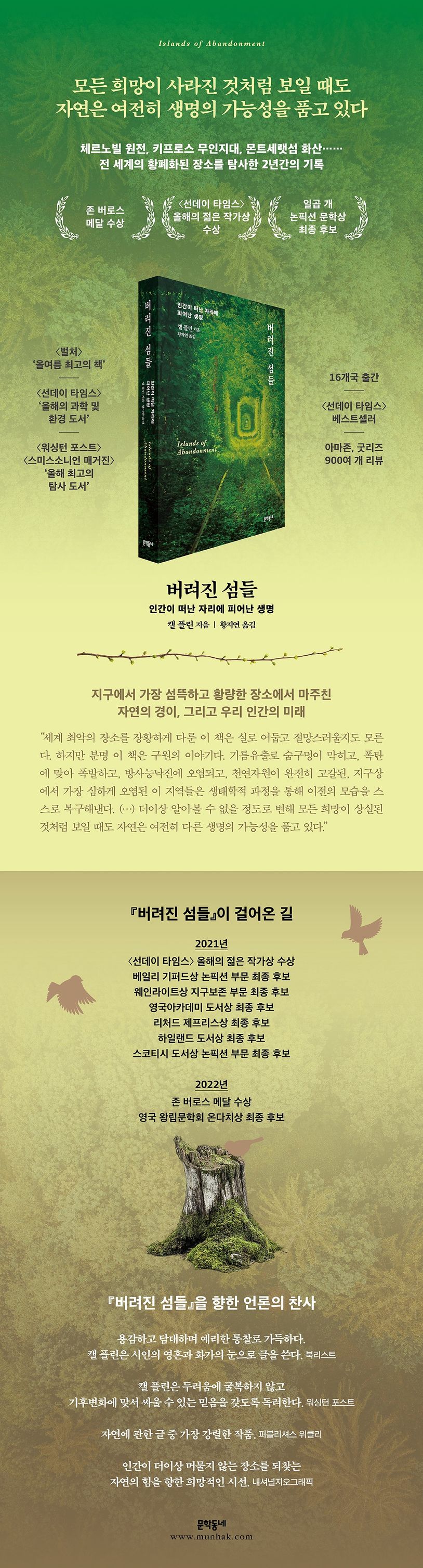 “자연에 관한 글 중 가장 강렬한 작품”이라는 찬사를 받은 『버려진 섬들』은 베일리 기퍼드상, 웨인라이트상, 영국아카데미 도서상 등 총 일곱 개 논픽션 문학상 최종 후보에 올랐으며, 〈선데이 타임스〉 올해의 젊은 작가상과 존 버로스 메달을 수상했다. 저자의 피땀어린 2년의 탐사와 자료조사 끝에 완성된 이 책은 글로 쓴 한 편의 환경 다큐멘터리이자, 우리에게 자연의 소중함과 미래에 대한 경각심을 일깨우는 가치 있는 기록이 될 것이다.