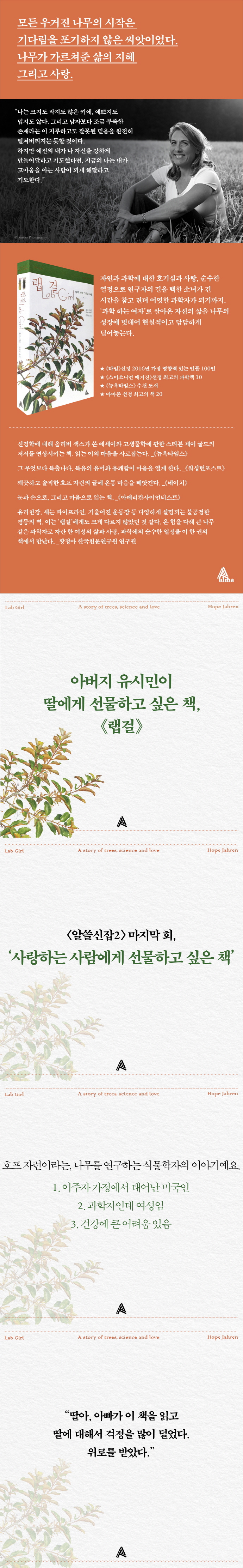 출판 기획안이 처음 공개된 2014년부터 미국 현지 10개 이상의 출판사가 경합을 벌여 화제가 되고, 2016년 출간과 함께 베스트셀러에 오르며 뜨거운 관심을 받은 《랩걸-나무, 과학 그리고 사랑》이 알마에서 출간되었다. 우리 시대의 위대한 의사 올리버 색스와 인문학적 자연주의자 스티븐 제이 굴드의 부재를 아쉬워하던 독자들에게 호프 자런이라는 ‘좋은 글을 쓰는 과학자의 등장’은 무엇보다 반가운 소식이다. 이 책을 먼저 읽은 미국의 독자들은 이렇게 고백한다. 처음에는 여성 과학자의 성공적인 커리어와 뛰어난 글솜씨에 끌려 책을 잡았지만 결국은 한 권의 책 안에 담긴 진솔한 자기 성찰과 이웃과 세상을 바라보는 따뜻한 시선에 공감하고 또 위로받았다고. 과학자를 꿈꾸던 소녀가 여러 번의 시행착오와 여성이라는 이유만으로 부닥친 사회의 높은 벽을 온몸으로 겪어내면서도 자연과 과학을 향한 사랑과 동료에 대한 믿음으로 꿋꿋하게 연구자의 길을 걸어 한 명의 과학자가 되는 이야기는 한 그루 나무의 성장을 지켜보듯 조마조마하면서도 매순간 즐겁고 경이롭다.