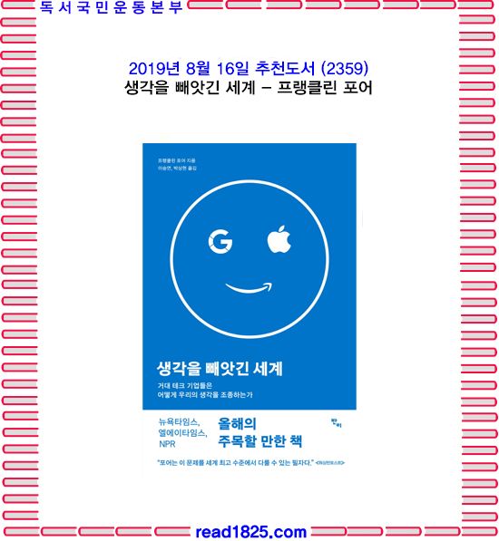 포어는 데카르트에서부터 시작해 앨런 튜링을 거쳐 오늘날 실리콘밸리 문화의 기원이 된 히피 정신과 스튜어트 브랜드까지, 테크놀로지에 관한 믿음의 지성사를 일목요연하게 정리해준다. 구글, 페이스북, 애플, 아마존의 기업적 야망은 오랫동안 인간이 지켜온 자유주의적인 가치들, 특히 지적 재산과 프라이버시의 개념을 뒤흔드는 것이다. 현재의 사회적·정치적·지성적 삶에서 이러한 총체적인 자동화와 획일화의 경향은 아직 초기 단계이고, 되돌릴 수 없는 변화가 아니다. 우리의 정신적, 지적 활동 전반에 걸쳐 개인적인(고유한) 권위를 회복하는 것은 이런 흐름을 되돌릴 수 있는 첫걸음이 될 것이다.