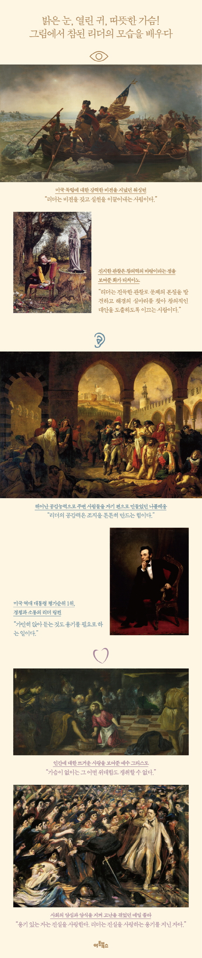 지은이는 특히 서양미술사에서 많이 찾아볼 수 있는 리더십 주제의 그림들을 살펴봄으로써 오랜 세월 사람들이 품어왔던 리더와 리더십에 관한 중요한 관념들을 깊이 통찰해보고, 거기서 오늘날 필요한 리더의 자질을 찾는 계기로 삼기로 했다. 책은 리더의 자질이나 덕목을 눈?귀?가슴 같은 신체와 관련된 범주로 구분해 다루고 있다. 1장 ‘리더의 눈’은 비전, 상상력, 창의력, 몰입, 통찰력 같은 리더의 ‘보는 능력’과 관련된 그림들을 다룬다. 즉, 그림을 통해 혜안이자 선견자로서 리더의 자질을 살펴보는 것이다. ‘제대로 볼 줄 아는’ 능력을 갖춘 예술가들의 미술작품은 시각적인 측면에 바탕한 리더의 자질을 살펴보기에 더없이 적절한 창이기도 하다. 2장 ‘리더의 귀’에서는 경청, 공감, 관용, 배려, 독서, 지혜 등 리더의 ‘듣는 능력’과 관련된 그림들이 소개된다. 리더가 진정한 헌신을 보여줄 때, 사람들은 진정으로 리더를 따르게 마련이다. 그리고 헌신의 출발은 다른 사람들의 이야기를 경청하는 데서 시작된다. 이 장에서는 특히 ‘존중의 리더십’이 강조된다. 3장 ‘리더의 가슴’에서는 희생정신, 헌신, 용기, 열정, 자신감, 결단력, 끈기 등 리더의 가슴속 능력과 자질을 표현한 그림들을 소개한다. 리더란 “더 많은 것을 얻기 위해 그 자리에 오르는 사람이 아니라 더 많은 것을 포기하기 위해 그 자리에 오르는 사람”이다. 타인을 위해 모든 것을 희생했을 때 다른 이들의 전적인 신뢰와 존경, 명예가 보상으로 주어진다. 여기서는 뜨거운 열정, 인내, 사랑을 보여주었던 리더들의 모습을 그림으로 만나본다.