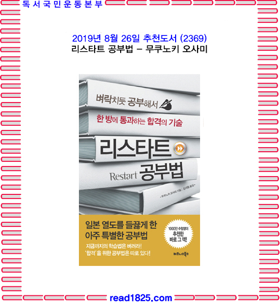 짧은 시간에 효과를 얻을 수 있는 기술을 알려주는 공부법 실용서『리스타트 공부법』. <도해 초고속 공부법>의 저자 무쿠노키 오사미가 풍부하고 짜임새 있는 사례를 바탕으로, 모범적인 공부법의 상식을 깨는 새로운 공부법을 제시한 책이다. 성적이 좋고 시험에 잘 합격하는 사람들에게는 공통적으로 '공부력'이 있다는 결론을 내린 저자는 공부를 잘할 수 있게 하는 7가지 능력을 알려준다. 효율력, 집중력, 기억력, 지속력, 계획력, 득점력, 실전력이라는 7가지 능력의 구체적이고 실용적인 사용법을 다루고 있다.