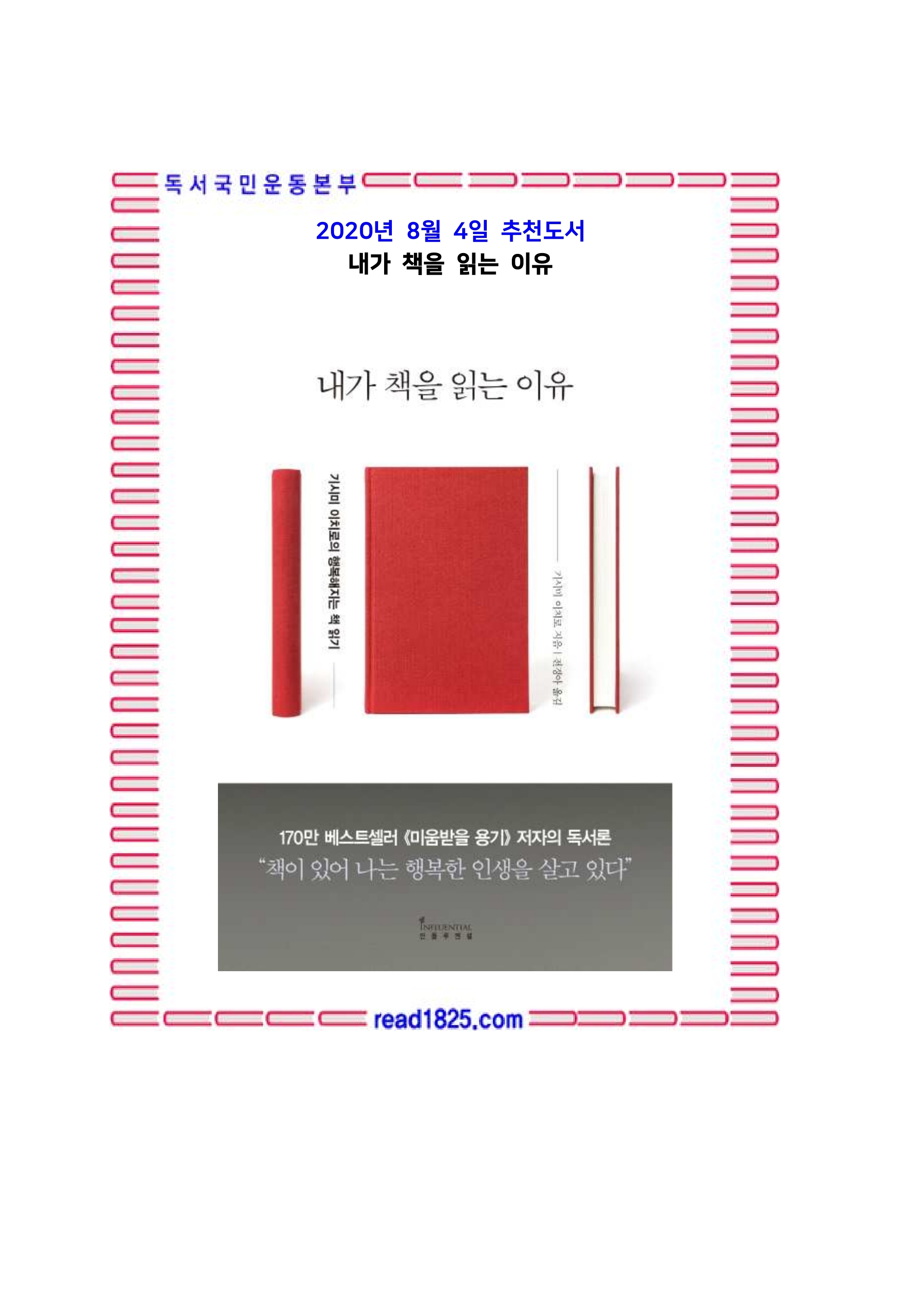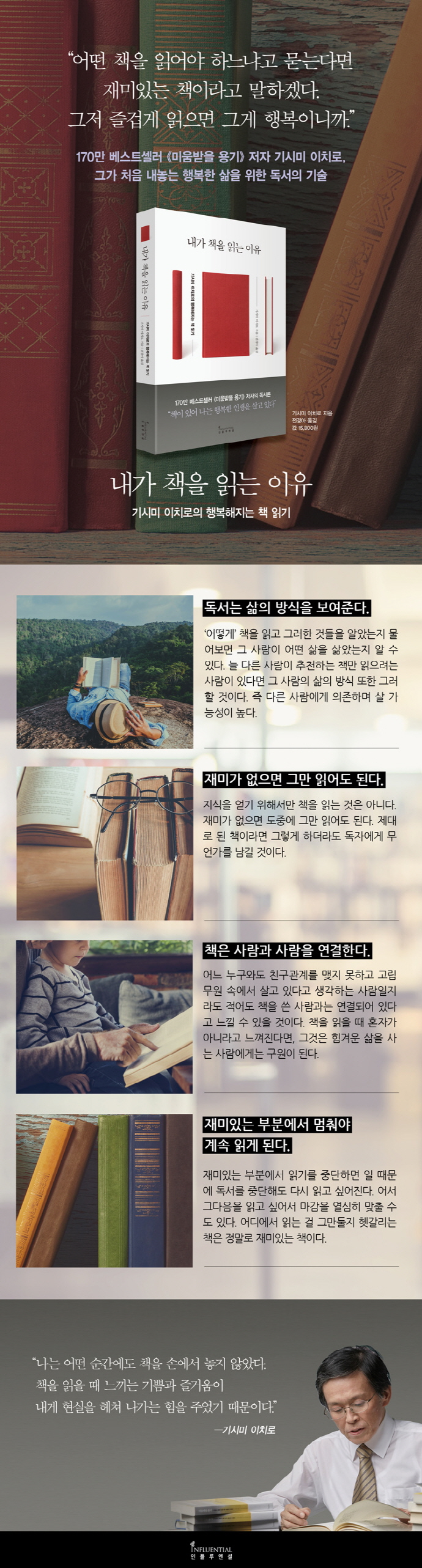 이러한 편견을 깨뜨리고 오로지 ‘즐거움’을 위해서 책을 읽을 수 있다고 말하는 사람이 있다. ‘행복한 삶’에 대한 안내자, 170만 독자를 사로잡은 《미움받을 용기》의 저자 기시미 이치로가 이번에는 ‘행복해지는 독서법’을 들고 돌아왔다. 그의 신작 《내가 책을 읽는 이유》는 독서의 즐거움을 알지 못했던 사람에게는 독서가 기분 전환 이상의 것임을 알려주고, 책을 좋아해 마지않는 사람에게는 책 읽는 즐거움을 전하는 책이다. 그는 “책을 읽는다고 행복해질 수 있는지는 잘 모르겠다. 하지만 나 자신은 책 읽는 기쁨과 즐거움을 알고 있기 때문에 책을 읽음으로써 행복한 삶을 살고 있다”고 말하며 자신의 행복한 독서 경험을 나누고자 한다.