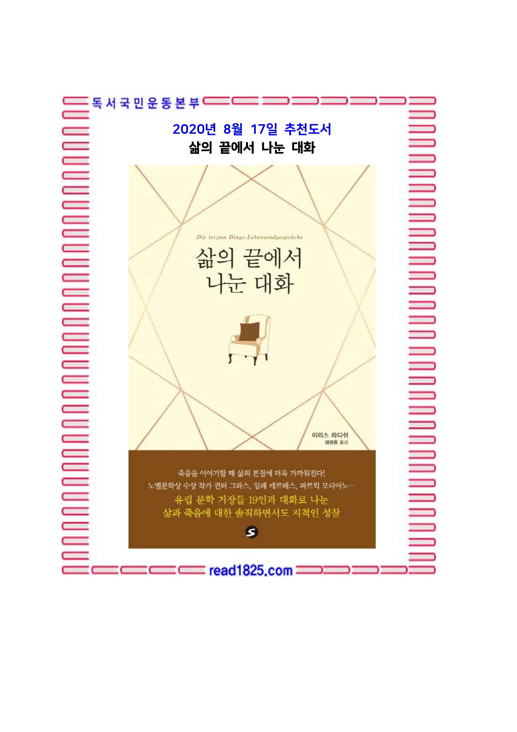 | 8월의 추천도서(2727) 살아있는 동안 꼭 생각해야 할 19가지 (0) | 2020.08.19 |