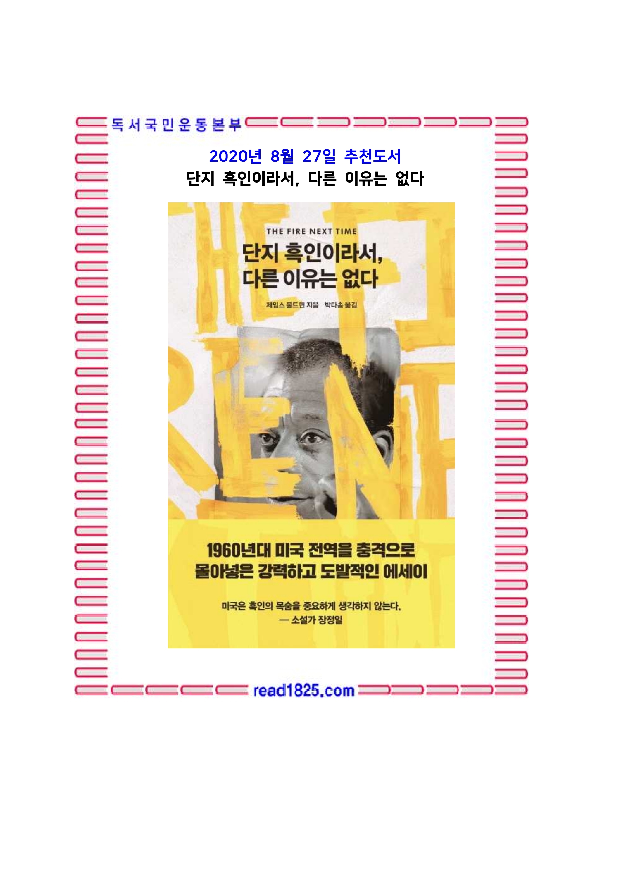 20세기 미국 현대 문학사의 위대한 축이자 민권 운동가인 제임스 볼드윈의 에세이 〈단지 흑인이라서, 다른 이유는 없다〉가 열린책들에서 출간되었다. 이 책의 원제는 〈The fire next time〉으로, 1963년에 단행본으로 발행되었다. 예언적이고, 맹렬하고, 영적이고, 야만적이고, 명료한 이 두 편의 에세이로 제임스 볼드윈은 미국에서 가장 중요한 작가 중 하나로 자리매김한다.