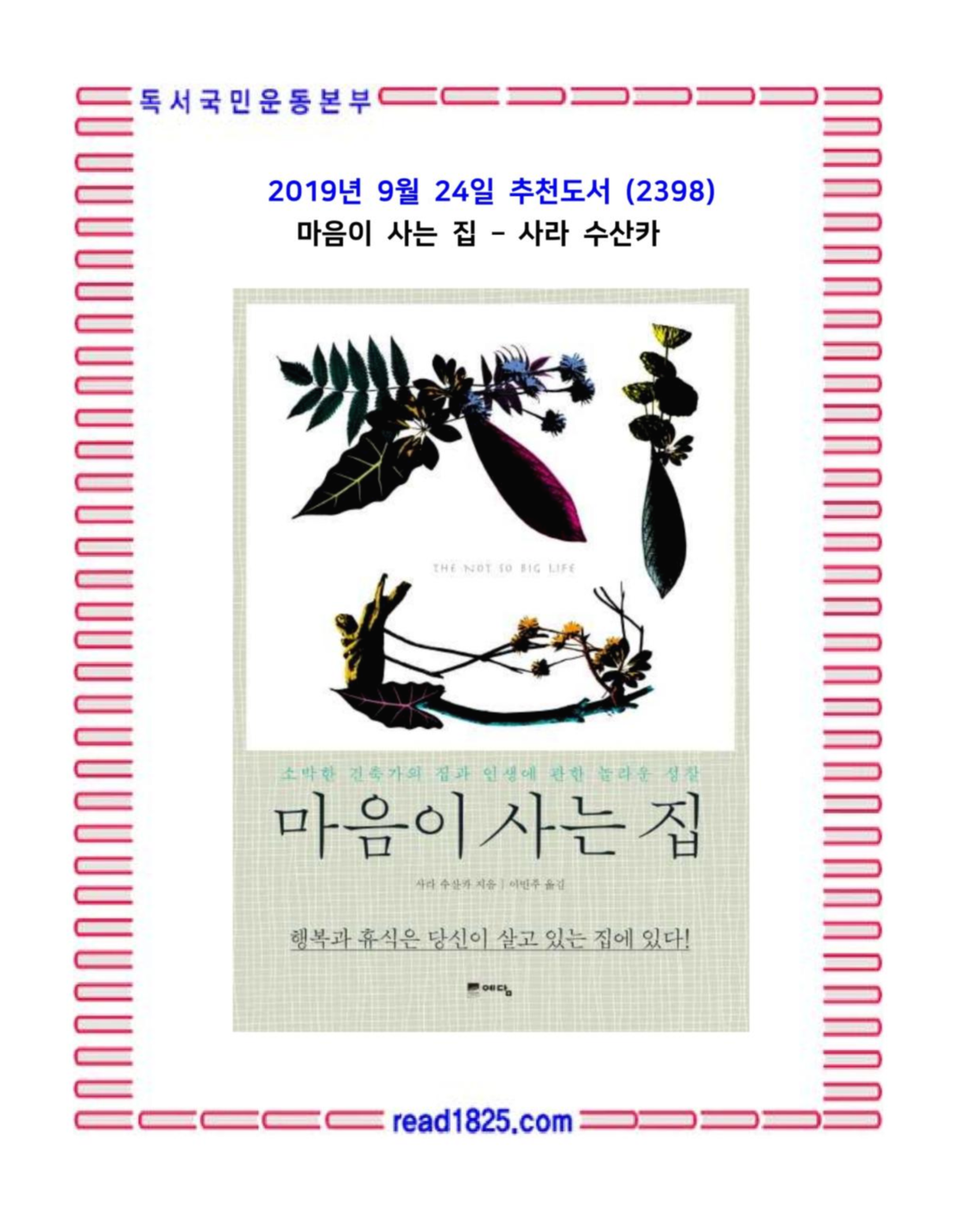 미국의 저명한 건축가이자 『그리 크지 않은 집The Not So Big House』을 통해 미국 전역에 ‘더 크지 않게 더 잘 짓자’라는 새로운 주택 건축 방식과 삶의 방식을 전파하여 선풍적인 바람을 일으킨 작가 사라 수산카의 책 『마음이 사는 집The Not So Big Life』이 출간되었다.