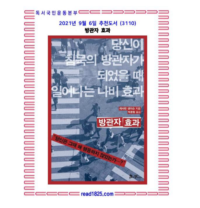 역사에 기록된 수많은 범죄와 악행을 저지른 이들은 소수에 불과했지만, 이들의 행위는 다수에 의해 쉽게 무시되거나 간과되었다. 나쁜 행동이 실현될 수 있었던 가장 중요한 요소는 악인들의 개인적 결정이 아닌, 다수의 선한 사람들이 침묵하지 않고 나서서 행동하지 못한 데에서 찾을 수 있다. 《방관자 효과》는 이러한 점에 주목해 이른바 ‘괴물’을 찾아내 막는 것만으로는 끔찍한 행동을 절대 막을 수 없다고 경고한다. 우리가 기억해야 할 것은 선한 사람을 나쁜 선택으로 이끄는 원인을 찾아내고 주변에서 목소리를 내야 그릇된 행동을 막거나, 적어도 줄일 수 있다는 점이다.