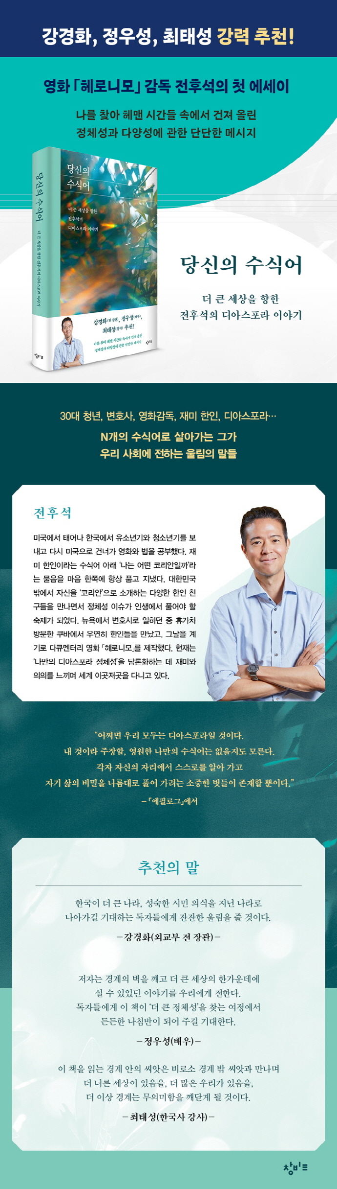 전후석은 미국에서 태어나 3살 때 한국으로 와서 청소년기를 보내고 다시 미국으로 가 영화와 법을 공부한 재미 한인이다. 대한민국에서 절대 다수의 일원으로 살다 미국에서 소수가 되는 경험을 한 뒤로 정체성에 대한 고민은 그림자처럼 항상 그를 따라다녔다. 자신의 수식어가 무엇인지 오랫동안 고민하던 그는 ‘디아스포라’라는 개념을 만난다. 본래 팔레스타인을 떠나 전 세계에 흩어져 사는 유대인을 일컫는 이 말은 저자의 삶 속에서 생명력 넘치는 말로 거듭난다.
