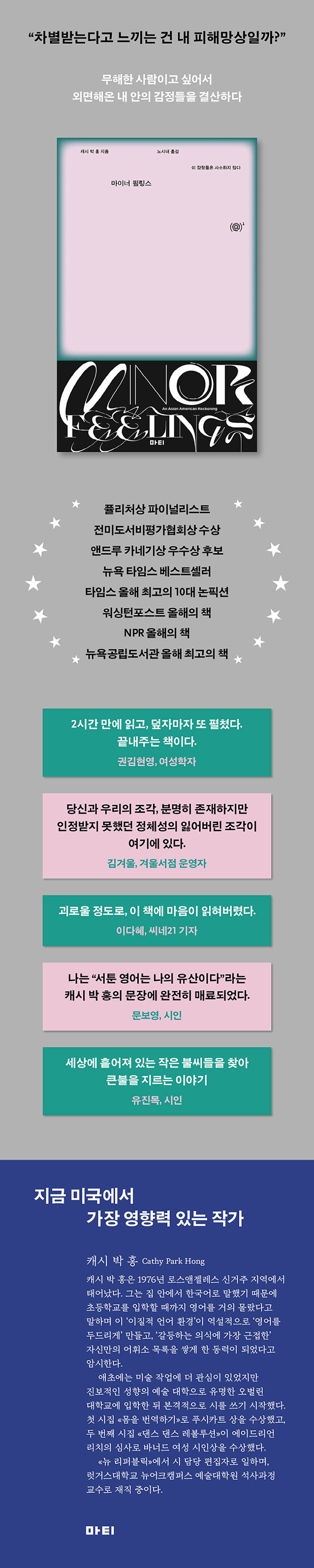 “『마이너 필링스』는 결코 사소하지 않다. 자극적이고 격렬한 이 에세이에서, 캐시 박 홍은 오늘날 아시아계 미국인이 느끼는 그것이 무엇을 의미하는지 낱낱이 그리고 선동적으로 따지고 든다. 사소한 감정은 절대적으로 필수적이다.”