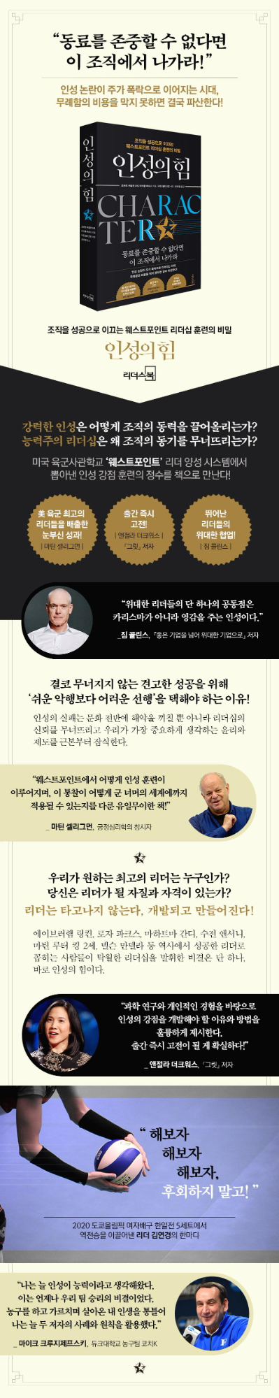 책에서는 웨스트포인트 인성 리더십의 모토인 “쉬운 악행보다 어려운 선행을 택하라”라는 말을 강조한다. 더는 성과를 쥐어짜는 능력주의 리더십이 통하지 않는 시대다. 모든 조직의 리더와 구성원은 『인성의 힘』을 읽고 새로운 시대에 발맞추어 개인의 삶을 개선하고 타인을 이끄는 리더로서 발전하는 방법을 배우게 될 것이다.