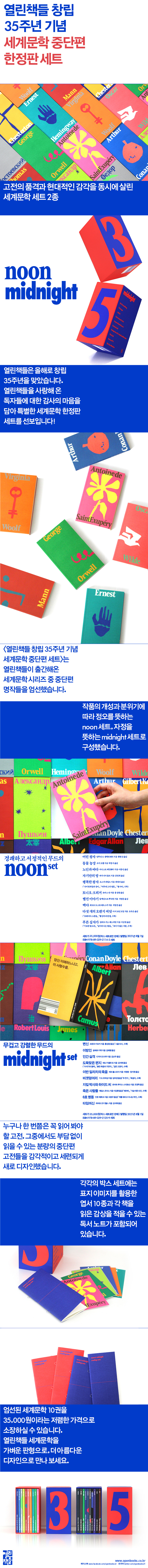 두 종류의 세트로 구성한 만큼, 특별히 서로 다른 무드의 세트를 만들고자 했다. 〈정오〉를 뜻하는 NOON 세트와 〈자정〉을 뜻하는 MIDNIGHT 세트로, 작품의 개성과 분위기에 따라 세트를 구성하여 독자들이 취향에 맞게 고를 수 있도록 한 것이다. NOON 세트에는 주로 밝고 경쾌하고 서정적인 작품들을, MIDNIGHT 세트에는 주로 어둡고 무겁고 강렬한 작품들을 모았다. 디자인 역시 각 세트의 분위기에 맞춰 각각 낮과 밤에 어울리는 색감으로 감각적으로 디자인했다. 저렴한 가격과 아름다운 디자인의 책으로 세계의 대표적인 중단편 명작들을 만나 볼 수 있는 좋은 기회가 될 것이다.