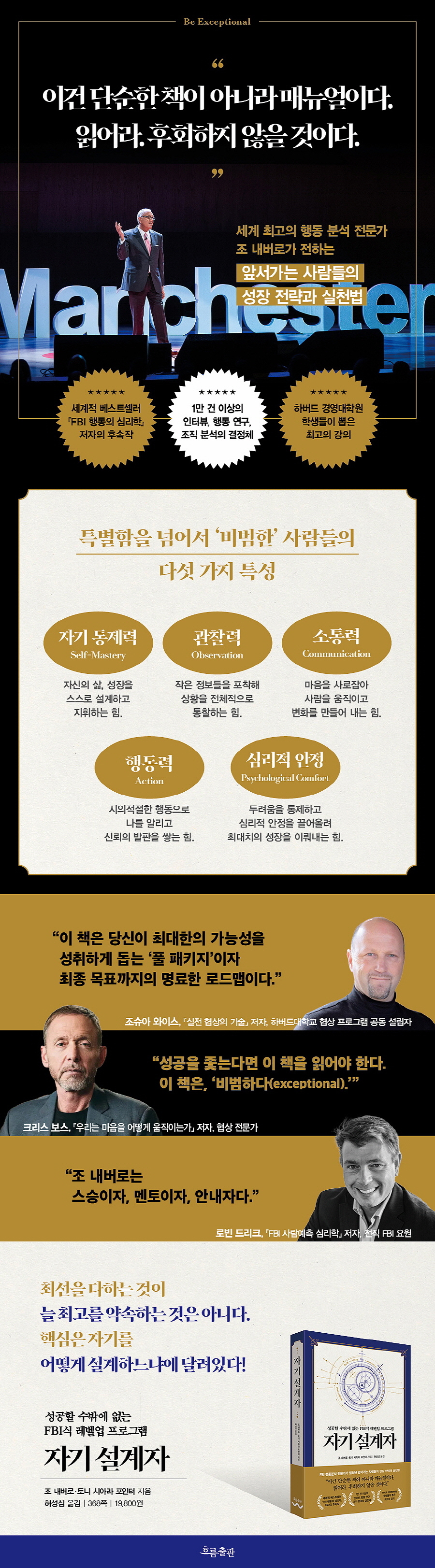 새로 소개하는 책 『자기 설계자』는 조 내버로의 40여 년의 경험과 통찰이 압축된 FBI식 성공학의 결정체이다. 스파이, 테러범부터 정치인, 세계적 기업의 CEO까지 다양한 사람들을 만난 경험, 그리고 1만여 건의 대면 조사, 행동 연구, 조직 분석에서 불변의 성장 공식을 뽑아냈다. 저자는 모두의 마음을 사고 선두에 서서 변화를 이끄는 독보적인 존재들, 특별함을 넘어서 남다른 존재감을 지닌 이들을 ‘비범한 사람들(The Exceptional)’이라 부른다. 그리고 ‘비범한 사람들의 다섯 가지 특성’을 훈련한다면 우리도 비범한 사람이 될 수 있다고 말한다.