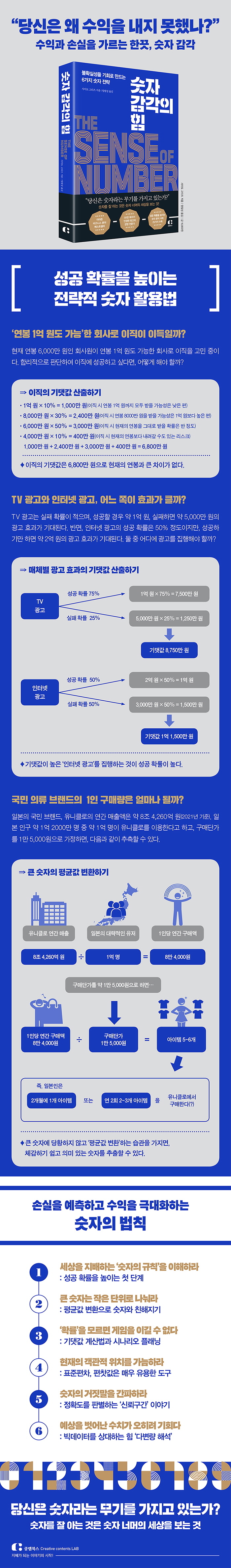 이 책은 숫자 감각을 키우기 위한 다양한 사례를 제시하며, 특히 성공 확률을 높이는 ‘전략적 숫자 활용법’에 초점을 맞춘다. ‘숫자에 약하다’고 하면 사실 ‘큰 숫자에 약하다’고 보는 것이 맞을 것이다. 큰 숫자와 친해질 수 있는 ‘평균값 변환’을 통해 기업의 연간 매출, 국가 예산, 코로나19 감염자수 등 체감하기 어려운 큰 숫자를 작은 단위로 나눠 나에게 의미 있는 데이터 값을 산출해볼 수 있다. 예를 들어 코로나 누적 감염자 수가 1000만 명을 넘었다는 수치는 크게 와닿지 않을 수 있지만, 인구수로 나눴을 때 약 5분의 1이 감염된 것이므로 자신의 회사에 대입해 다음과 같이 생각할 수 있다. ‘회사의 사원은 200명, 아직 20명이 채 감염되지 않았으니 사내 방역은 비교적 잘되고 있는 것 같다.’