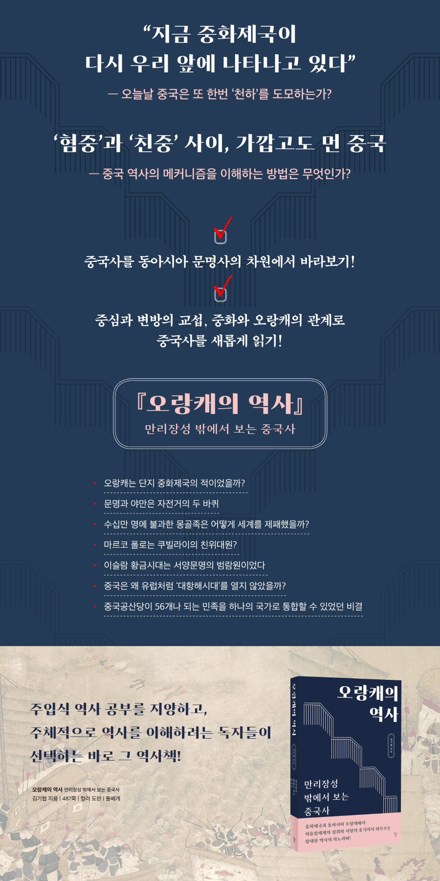 『오랑캐의 역사-만리장성 밖에서 보는 중국사』는 중화제국과 오랑캐의 대립 및 교섭의 역사를 통해, 단일국가의 프레임으로 한정할 수 없는 중국과 변경의 역사 그리고 동아시아 문명사를 다룬다. 나아가 중국 및 동ㆍ서양과 모두 교류한 이슬람세계의 역할, 근대 이후 서양의 흥기와 중국 침략에 이르기까지 세계사를 폭넓게 아우른다.