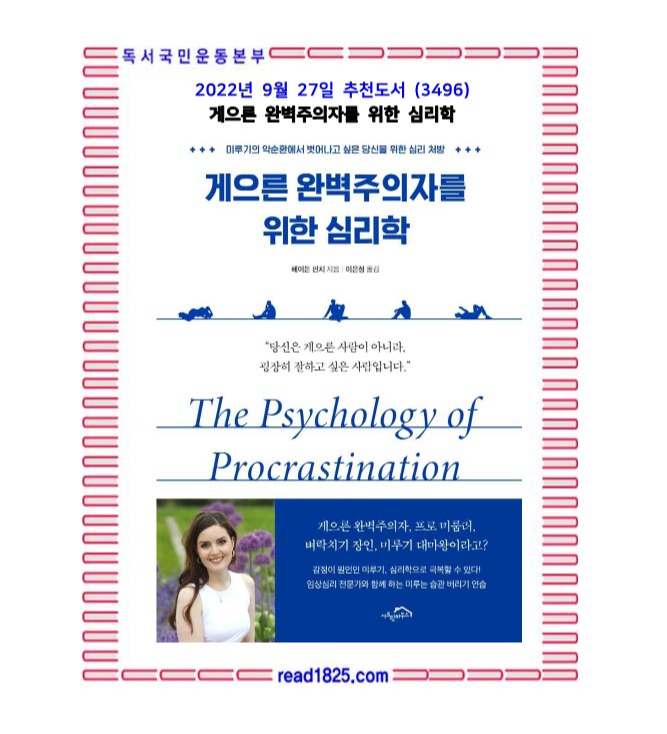 할 일을 미루는 사람들이 있다. 그들은 미룰 수 있을 때까지 미루다가, 더 이상 미룰 수 없을 때쯤 “지금 안 하면 죽음이다”하며 벼락치기로 일을 처리한다. 지금 미루면 나중에 더 큰 스트레스를 받고, 작업의 질은 떨어지며, 마음의 안정을 어지럽히는 등 결과가 뻔히 보이지만 미루는 사람들. 그들은 능력도 있고, 하려고 노력도 하지만, 이러면 안 된다는 것을 알면서도, 안 한다. 이들은 일면 게을러 보인다. 미루는 사람 스스로도 자신이 게으른 사람이라고 자책한다. 그런데 정말 게으르고 절제력이 낮은 사람들일까? 아니다. 오히려 너무 완벽하게 잘하고 싶은 부담감에 짓눌려서 시작을 못 하는 사람들이다.