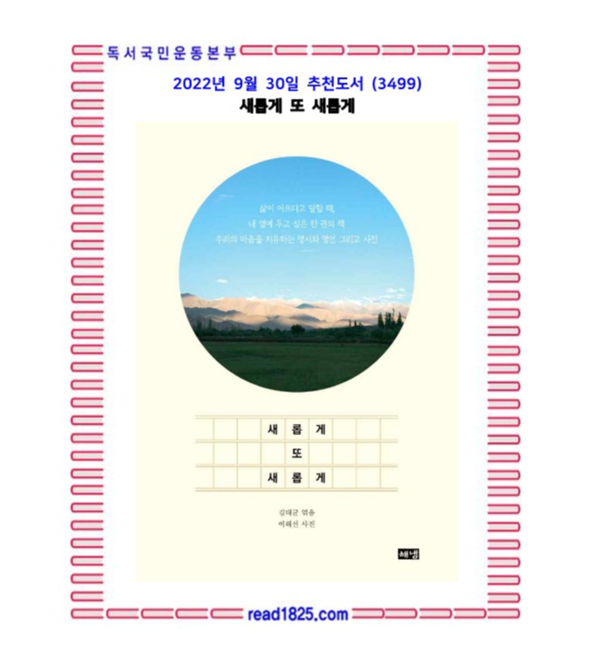 자칫 병원이라는 삭막해지기 쉬운 공간에 시와 명언 그리고 사진으로 온기를 더하고 긍정의 에너지를 채워간 김태균 원장의 실천이, 반복되는 일상에서 쳇바퀴 돌듯 살아가는 많은 이들에게 또 다른 삶의 동력이 되기를 바란다. 독자들은 「프롤로그」의 말처럼 “시련 속에서 탄생한 인류의 숭고한 정신의 표상”인 명시와 명언이 주는 힘을 이 책을 통해 발견하게 될 것이다. 또한, ‘시’의 아름다움을 통해 문학적 소양을 쌓고, ‘명언’에 담긴 지혜와 통찰을 배울 수 있다. 궁극적으로 어제보다 더 나은 삶을 사는 데 『새롭게 또 새롭게』가 삶의 나침반이 되었으면 한다.