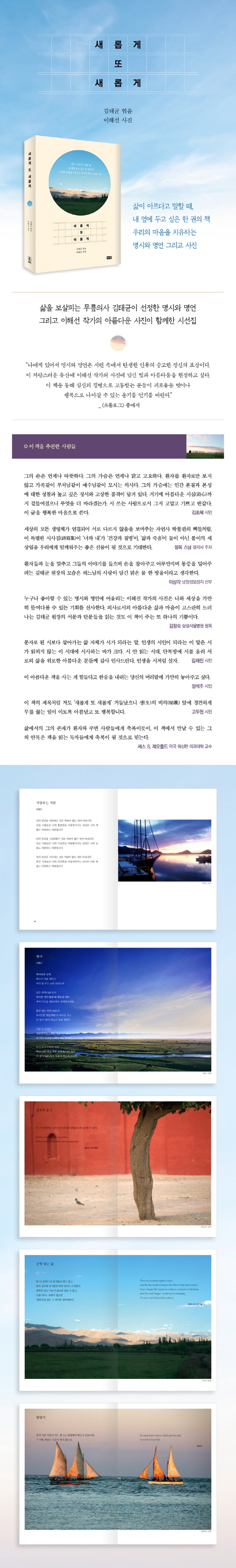 『새롭게 또 새롭게』는 국내외 ‘무릎의사’로 널리 알려진 전 분당서울대학교병원 관절센터 교수이자 티케이(TK) 정형외과 대표원장인 김태균 박사가 150여 편의 시와 명언을 엮은 시선집이다. 각 시와 명언에는 “사물과의 깊은 교감을 절제된 앵글에 담아 사진을 찍는” 이해선 작가의 작품이 함께 실려 있어 잔잔한 여운을 준다.