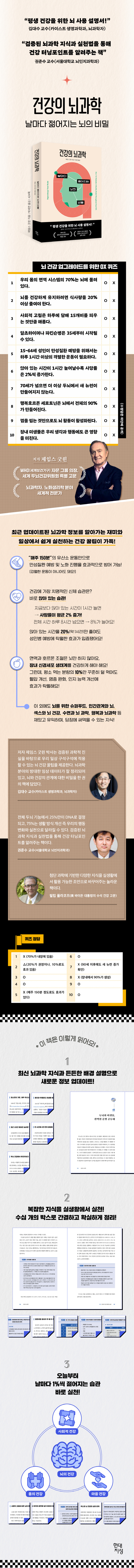 그런데 누군가가 다가와 몇 가지 간단한 실천만 하면 두뇌를 명석하게 만들고, 또한 그 상태를 계속 유지할 수 있다는 이야기를 한다면? 그리고 실천 과제도 쉽고 부담스럽지 않고 재미있기까지 하다면? 더 나아가, 그 방법들 모두 과학적으로 ‘검증된’ 것이므로 일시적인 유행을 따라가느라 시간을 허비할 위험도 없다면? 더군다나 그렇게 정리해주는 사람이 세계 두뇌건강위원회의 특별 고문이면서, 노화와 관련된 주제에 관해서는 가장 대중적이고 실행 가능한 조언을 해온 전문가 중 한 명이라면?