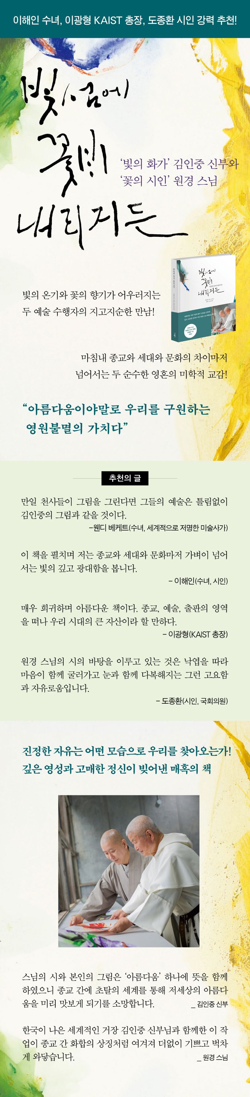 김인중 신부는 ‘꽃의 시인’ 원경 스님의 시 세계에 깊이 공감했고 원경 스님은 ‘빛의 화가’ 김인중 신부의 구도자적 삶에 존경과 섬김으로 그림 곁에서 마음의 시를 썼다. 이 책에는 우리에게 너무나도 익숙히 알려진 이해인 수녀의 찬사가 담겨있다. 김인중 신부와의 자매적 우정이 담겨있는 글이 곱기만 하다. 도종환 시인의 원경 스님을 향한 찬사도 아름답다. 카이스트 이광형 총장은 추천의 글을 통해 “매우 희귀하며 아름다운 책이다. 종교, 예술, 출판의 영역을 떠나 우리 시대의 큰 자산이라 할 만하다”라고 평했다.