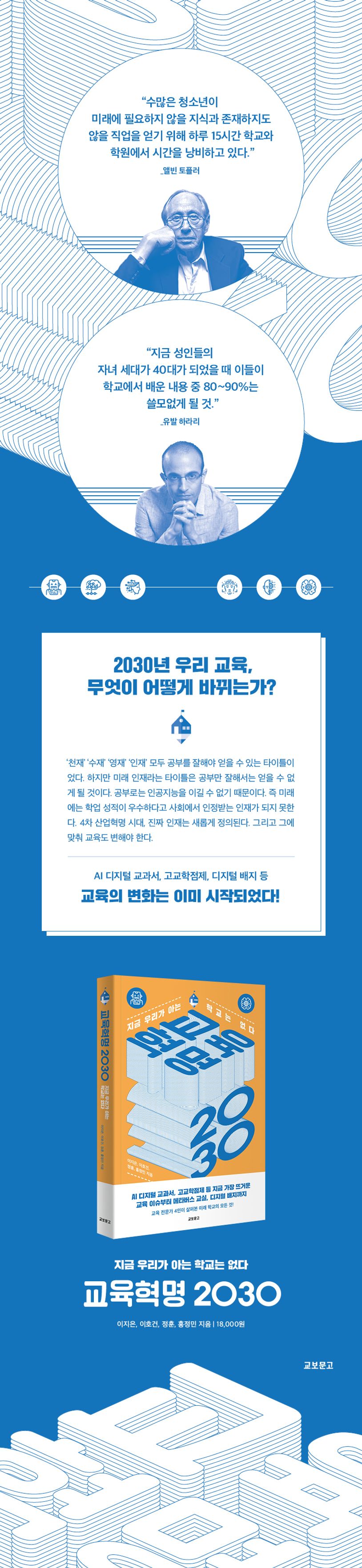 《교육혁명 2030》은 이런 궁금증에 답을 주기 위해 교육 분야 전문가들이 모여서 논의하고 그 결과물을 정리한 책이다. 지금 이 순간에도 일어나고 있는 교육의 변화를 점검하고, 미래 교육이 어떻게 바뀔지 전방위적으로 살펴본다.