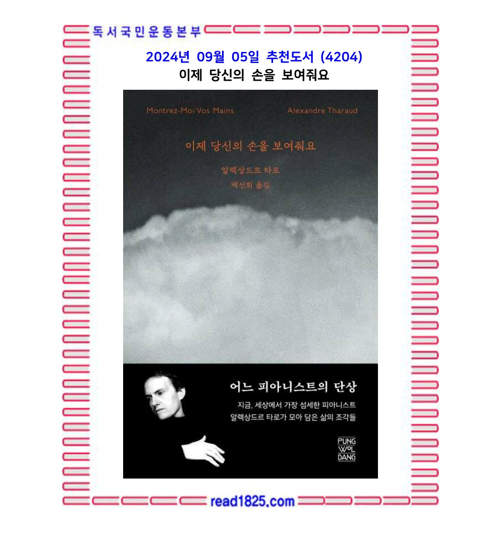 피아니스트 알렉상드르 타로가 자기 자신이라는 존재에 대해 직접 써내려간 에세이 『이제 당신의 손을 보여줘요』. 단순한 자기 삶의 편력이 아니라 다양한 소재들을 자유롭게 이어 나감으로써 훨씬 풍부한 사색을 담은 에세이를 창조했다. 저자가 콘서트 피아니스트로서 겪고 관찰한 일들, 즉 그가 살아가는 세계에 관한 묘사로 확대된다. 일류 콘서트 피아니스트가 아니면 볼 수 없는 풍경들이 가득하다.