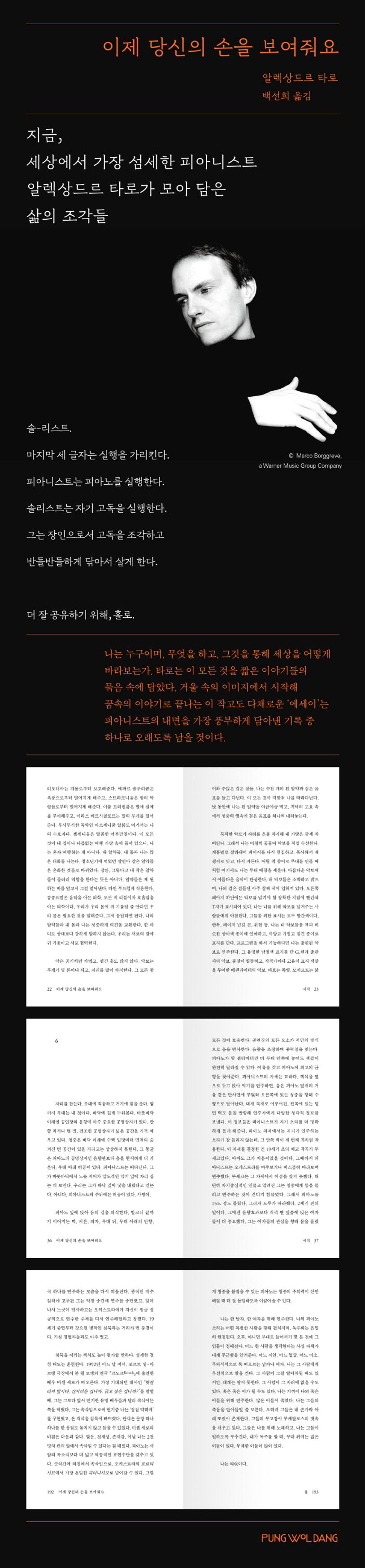 알렉상드르 타로는 이 어려운 작업을 성공적으로 해낸 최초의 피아니스트일 것이다. 공연 직전, 대기실의 거울에 비친 자신을 ‘타인’으로 인식하면서 시작되는 그의 에세이 『이제 당신의 손을 보여줘요』는 자기 자신이라는 존재에 대해 직접 써내려간 이야기다. 그래서 그는 피아노 혹은 피아니스트에 대해 이야기하기에 앞서 자신의 꿈과 몸을 언급한다. 어릴 때부터 겪었던 불면증이 남긴 흔적들이 묘사되고, 이를 극복하기 위해 복용해 온 알약들의 이름이 마치 시처럼 이어진다.