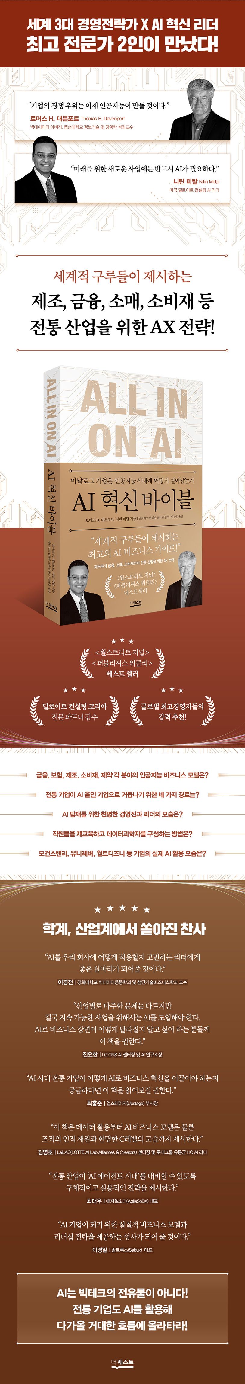미탈 대표 역시 뉴욕 AI 서밋에서 ‘AI 혁신가상’을 수상했으며, 글로벌 전략 및 M&A 리더로 활동 중이다. 저자들은 단순히 ‘AI 활용’에 그치지 않고 미래 산업에서 경쟁 우위를 갖는 ‘AI 올인’ 기업으로 거듭날 수 있도록 기술, 데이터, 비즈니스 전략, 역량, 리더십 등 다양한 측면에서 AI 활용 전략을 제시한다. 이에 글로벌 기업의 경영자들은 이 책을 전통 기업을 위한 ‘AI 바이블’로 꼽는다.