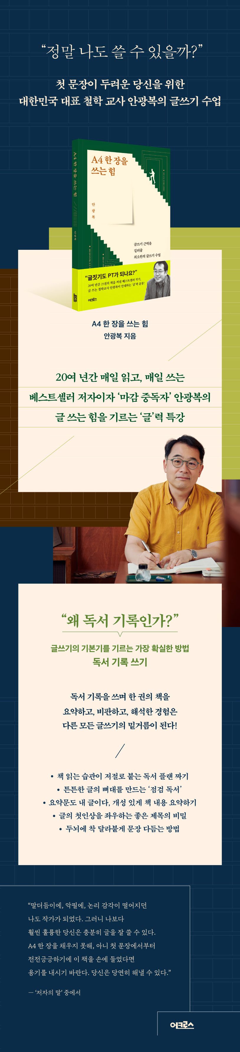 운동을 전혀 못 하던 사람이 팔굽혀펴기를 할 수 있게 되었을 때 느끼게 될 환희를 생각해보자. A4 한 장을 쓰는 힘을 갖추었을 때 우리 모두에게도 그런 환희의 순간이 찾아올 테다. 제대로 풀린 적 없던 논리적인 글쓰기에 성공했을 때, 블로그나 SNS에 올리고 싶은 글 한 편을 완성했을 때, 누구에게 보여주지 않더라도 내 삶에 대한 더 수준 높은 기록을 쓸 수 있게 되었을 때, 그때의 경험은 이전과는 완전히 다를 것이다. 이 책은 논리적인 글쓰기를 배우고 싶은 학생, 글쓰기의 기본기를 가르치고 싶은 교사, 열심히 읽은 책에 대해 남부럽지 않은 글 한 편을 써보고 싶은 독서가 등 글쓰기에 자신 없어 움츠러든 적이 있는 사람에게 글쓰기의 짜릿함을 선사해줄 것이다.