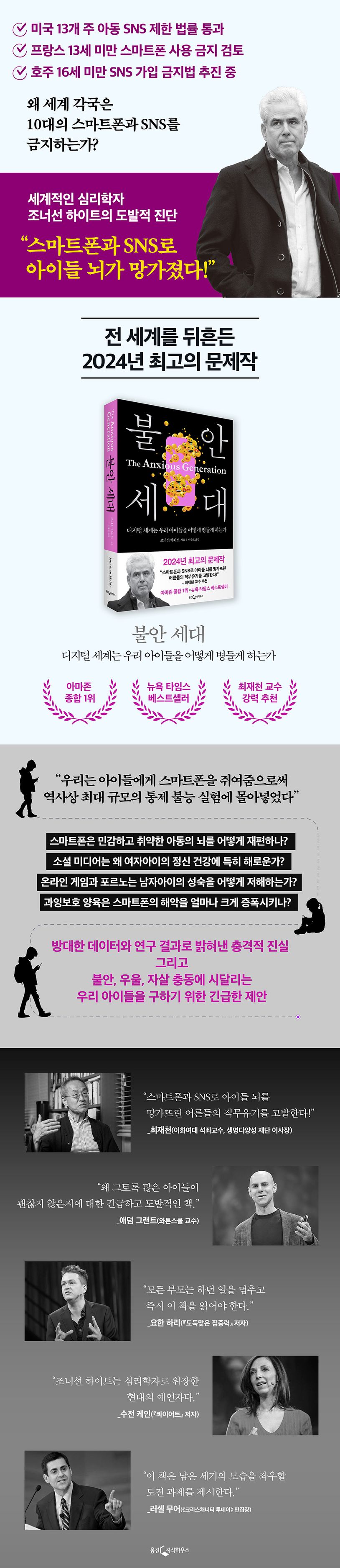 세계적인 사회심리학자 조너선 하이트의 신작 『불안 세대』가 전 세계를 뜨겁게 달구고 있다. 베스트셀러 『바른 마음』으로 ‘영미권에서 가장 논쟁적인 학자’으로 부상한 그는 스마트폰과 소셜 미디어, 인터넷이 청소년 정신 건강 위기를 초래하고 있다는 충격적인 주장을 내놓는다. 이 책은 출간 즉시 아마존 종합 1위, 뉴욕 타임스 베스트셀러, 선데이 타임스 베스트셀러를 기록하며 전 세계에 십대의 스마트폰과 SNS 규제 논쟁을 불러일으키고 있다.