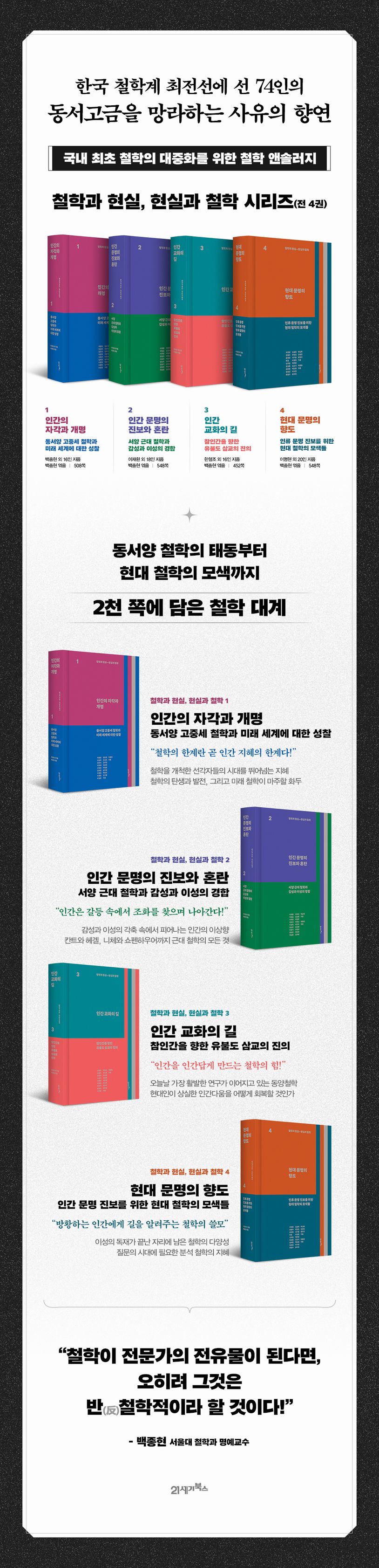 깊이 있는 사유, 정통 인문학에 대한 갈증을 느끼는 독자를 위한 『철학과 현실, 현실과 철학 1~4』 시리즈(21세기북스)가 출간되었다. 다양한 세부 전공을 가진 74인의 철학자가 공저한 이 시리즈는 총 4권으로 구성된 2,000쪽이 넘는 분량이다. 동서양 고대 종교 사상부터, 유교, 노장, 성리학, 불교 철학, 인도 철학, 서양 중세 철학, 서양 근대 철학, 분석 철학, 포스트모더니즘 철학까지 세계 철학의 모든 주제를 망라했다.