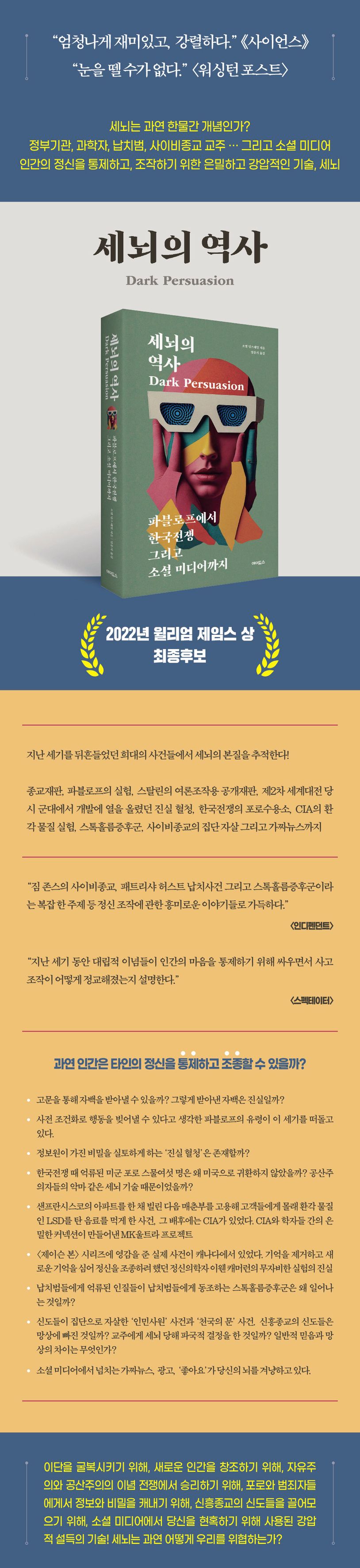 잔혹한 고문과 심문, 수면 박탈, 행동 조건화, 사상 주입, 진실 약물, 기억의 제거와 복원, 납치범과 인질, 사이비종교의 집단 자살, 가짜뉴스와 소셜 미디어…. 세뇌의 역사를 들여다보면 인류의 온갖 어두운 이야기가 등장한다. 그 이야기의 배후에는 정부기관의 관계자와 군대와 행동과학자, 정신과 의사, 신경과학자, 범죄자들과 사이비종교 지도자들이 등장한다. 1950년대부터 1960년대에 걸쳐 진행된 이른바 MK울트라 프로젝트 중에는 아파트 한 채를 빌려 매춘부를 고용, 고객들을 대상으로 몰래 LSD를 탄 음료를 복용하게 하거나 공중에 에어로졸 형태로 LSD를 뿌린 실험도 있었다.(168~169쪽) 원하는 정보를 캐내는 데 환각물질인 LSD가 효과가 있는지 보기 위한 실험이었다. 주동자는 놀랍게도 CIA였다. 한국전쟁 당시 중국과 북한에 억류된 미군 포로들 중 자유세계로 귀환하지 않은 군인들이 등장하자 공산진영의 세뇌 공작이 효과를 발휘했다고 생각한 미국 정부는 비밀리에 대규모 자금을 학계에 쏟아 부으며 프로젝트를 진행했다. 지은이는 모진 고문과 수면 박탈, 공개재판, 정신 개조 등과 같은 고전적인 세뇌 기술부터 CIA가 벌인 LSD 환각 실험, 정신의학자 이웬 캐머런의 정신 조종 프로젝트, 사이비종교의 집단 자살과 같은 상상을 초월하는 사건들을 파헤치면서 은밀하고도 강압적인 설득의 기술이 어떻게 정교하게 다듬어져 현대의 신경과학과 가짜뉴스와 소셜 미디어까지 이어지는지를 살펴본다.