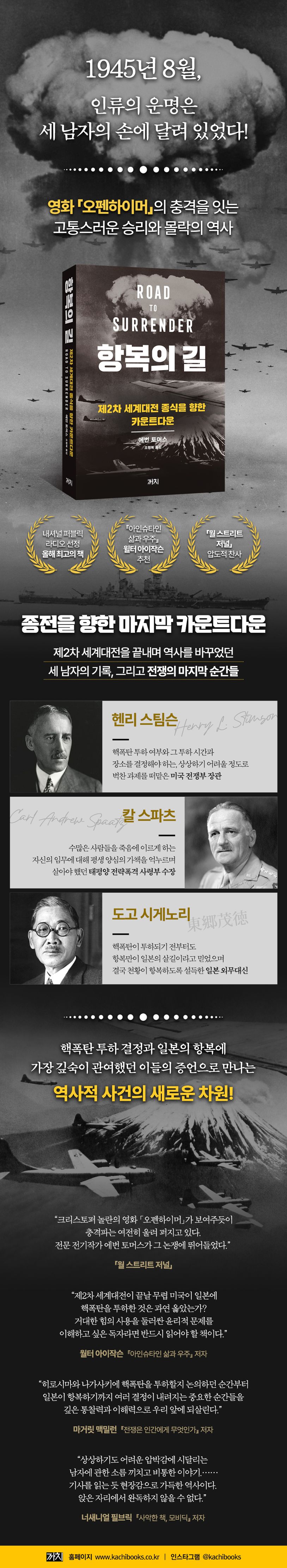 영화 「오펜하이머」가 핵폭탄의 탄생 과정을 조명했다면, 책 『항복의 길』은 그후 이 파멸의 무기가 실질적으로 어떻게 활용되었는지, 즉 제2차 세계대전의 종전을 어떻게 이끌어냈는지를 깊이 있게 다루며 일본의 항복을 이해하는 데에 새로운 차원을 더한다. 내셔널 퍼블릭 라디오가 2023년 올해 최고의 책으로 선정한 이 책에는 핵폭탄이 일본에 투하되기 전후, 제2차 세계대전의 지옥과도 같았던 마지막 몇 주일이 무시무시할 정도로 생생하게 담겨 있다. 더 많은 사람들을 살리기 위해서는 강력한 무기로 많은 사람들을 죽여야 한다는 도덕적 딜레마에 고뇌하던 미국인들과, 굴욕적인 패배가 확실시되었음에도 불구하고 무조건 항복을 권고하는 포츠담 선언을 묵살하면서 어떻게든 천황제를 보존하려던 일본인들의 외적, 내적 갈등이 적나라하게 밝혀진다.