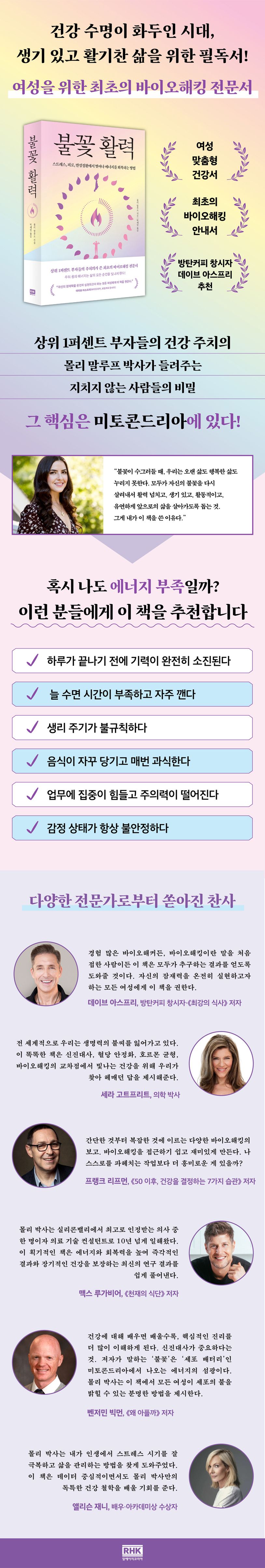 오늘날 많은 이들이 겪는 에너지 고갈은 만성 피로, 스트레스, 무기력을 가져오는 심각한 문제다. 이 책은 여느 건강서와 달리 ‘나이 듦’에만 초점을 맞추고 있지 않다. 저자는 우리 몸에 에너지를 공급하는 생명의 불꽃 역할을 하는 세포 ‘미토콘드리아’에 주목한다. 좀처럼 해결되지 않는 만성 스트레스, 배달 음식으로 때우는 끼니, 하루 종일 앉아서 일하고 퇴근 후에는 화면을 앞에 두고 멍하니 있는 시간…… 이러한 것들이 모여 한 사람의 불꽃을 꺼뜨린다고 저자는 이야기한다. 특히 이 책은 여성의 건강에 초점을 맞추고 있다. 남성과 여성의 몸은 다르다. 주기에 따라 호르몬 변화를 겪는 여성의 몸에는 고유한 창조적 에너지가 있고, 그렇기에 훨씬 더 복잡하고 흥미롭다. 이 책은 특히 여성의 고유한 생명 활동에 중대한 영향을 미치는 관계, 사랑, 성생활, 피임, 임신, 음식, 운동, 스트레스에 관해 한층 더 다양한 이야기를 담고 있는 여성 맞춤형 건강서다.