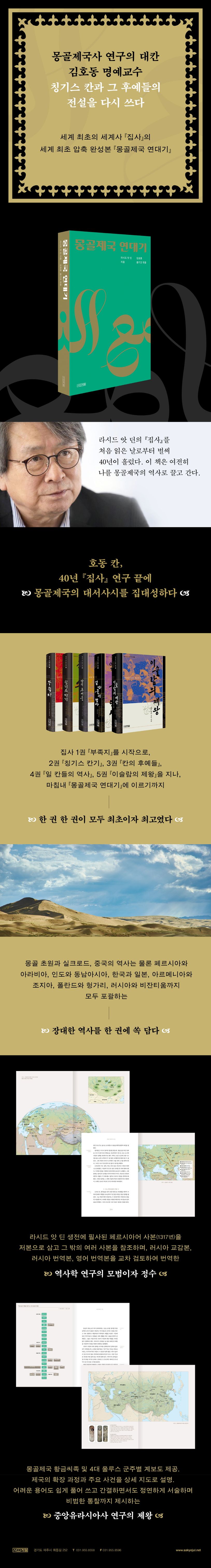 『몽골제국 연대기』는 모두 합쳐 5권, 2246쪽에 달하는 『라시드 앗 딘의 집사』를 제국의 등장과 팽창, 완성 과정을 중심으로 한 권으로 요약한 축약본이다. 거기에 몽골제국 황금씨족 및 4대 울루스 군주별 계보도, 제국의 확장 과정과 주요 사건에 대한 상세 지도 등을 추가하여 역사책 읽기의 즐거움을 배가하였다. “라시드 앗 딘의 『집사』를 처음 읽은 날로부터 벌써 40년이 흘렀다. 이 책은 여전히 나를 몽골제국의 역사로 끌고 간다”라는 김호동 교수의 안내를 따라 중앙유라시아의 초원으로 역사 여행을 떠나자.