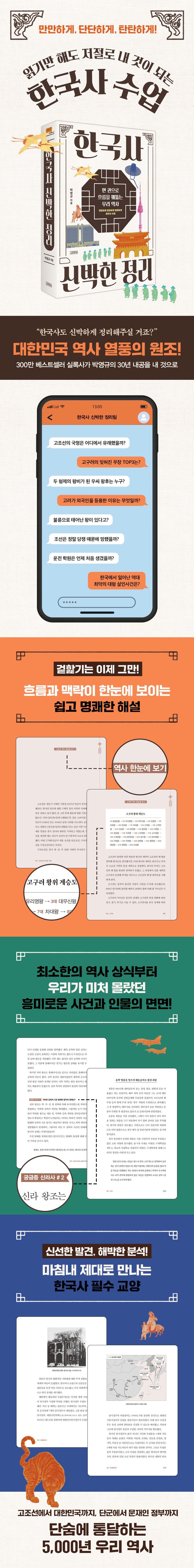 《한국사 신박한 정리》는 사건, 연도, 이름만 반복하는 대신 한국사의 전체적인 맥락을 일목요연하게 짚어준다. 왕조마다 왕위 계승도를 삽입해 시대의 흐름을 연결해주며, 간략하게 사건만 나열하거나 몇몇 주요 인물에만 집중해 역사의 큰 그림을 파악하기 어려웠던 기존의 책들을 보완해 한국사의 다양한 면면을 입체적이고도 균등하게 해설한다.
