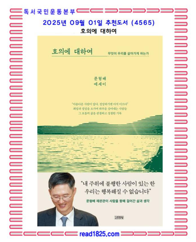그의 생각을 엿볼 수 있는 책 《호의에 대하여》(김영사 刊)가 출간되었다. 산책길과 등산길에서 발견한 사람을 닮은 나무, 무경험을 극복하기 위해 읽은 책, 받은 것을 사회에 되돌려주라던 김장하 선생과의 추억, 법을 몰라 손해 보는 이들을 헤아리는 마음, ‘자살’을 시도했던 재소자가 ‘살자’는 다짐을 하게 만든 선물, 사랑하는 이를 그리워하며 속절없이 흘리는 눈물, 그리고 건강한 법원과 사회를 향한 진심 어린 조언…. 자작나무에서 지리산으로, 도스토옙스키에서 몽테스키외로, 일상에서 재판까지, 문형배 재판관이 1998년부터 작성한 1,500여 편 중 일상을 대하는 태도(1부), 두세 번씩 읽었던 책들에 대한 감상(2부), 법원과 사회에 바라는 점(3부) 등 120편을 선별해 담았다.