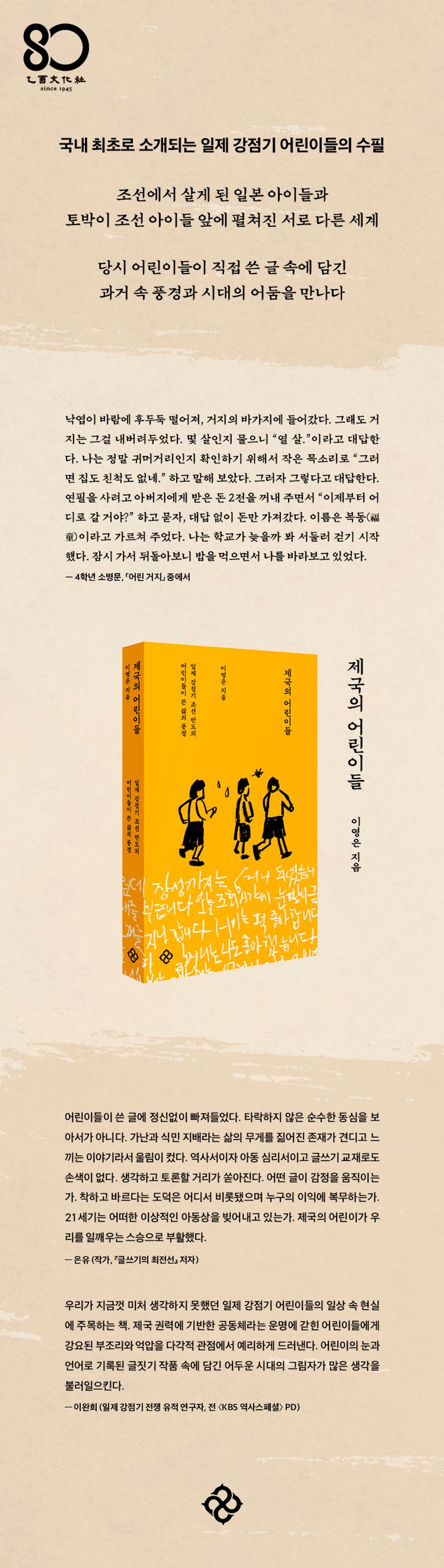 『제국의 어린이들』은 그 어른들의 세계 중에서도 가장 극단적인 세계에 속하는 군국주의 제국 식민지가 어린이들을 어떤 모습으로 기르려 했는지 알려 준다. 특히 조선 지역에 살게 된 일본인 어린이들의 세계와 토박이 조선 어린이들의 세계를 함께 선보이는 이 책의 시도는 지금껏 만날 수 없었던 방식이다. 독자들은 자연스럽게 대조되는 이 두 세계를 바라보면서 어린이가 출신 사회와 배경의 차이에 따라 어떻게 다른 세계관을 학습하게 되는지 확인할 수 있다.