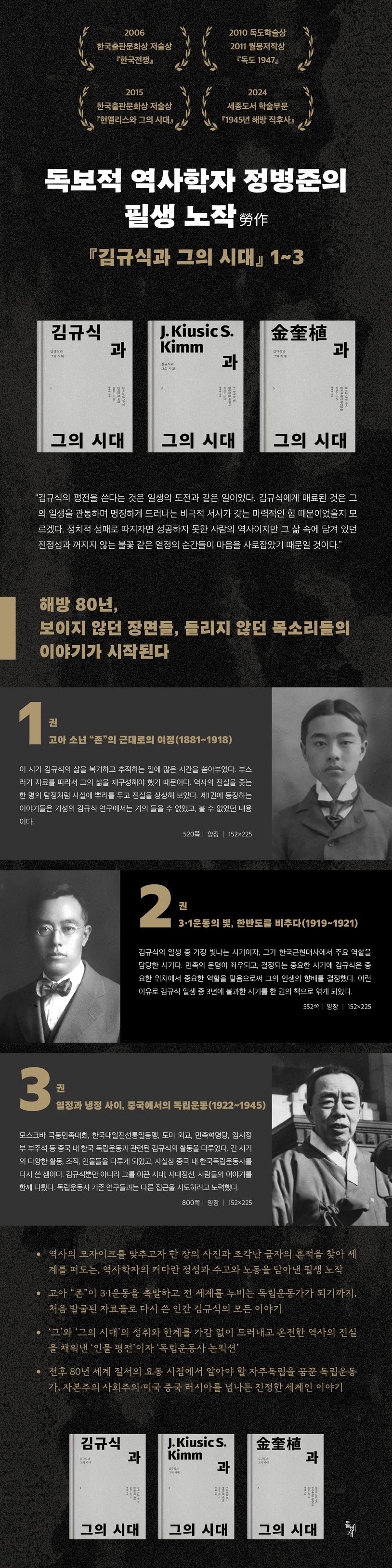 마침내 한국출판문화상 학술 저술 부문을 두 차례 수상한(2006년 『한국전쟁』, 2015년 『현앨리스와 그의 시대』) 독보적 한국현대사 연구자, 역사학자 정병준 이화여대 교수가 해방 80주년을 맞아 『김규식과 그의 시대』(전 3권)를 출간한다. 1919년 단기필마 1인 외교로 〈파리강화회의〉에서 한국통신국을 설립하고 전 세계에 자주독립을 외치며 3ㆍ1운동의 불씨가 됐고, 해방 전 임시정부에서 부주석을 역임했던 탁월한 독립운동가 김규식. 그러나 그의 진면목은 단편적으로 전해지는 몇몇 화려한 일화들을 제외하면 해방 80년을 맞이하는 지금까지도 정확히 발굴되지 못한 채 묻혀 있었다. 이 책은 김규식의 일생을 관통하며 명징하게 드러나는 한 인간의 비극적 서사와 함께, 비록 정치적으로는 성공하지 못했을지언정 민족과 역사, 자주와 독립을 가슴속에 품고 최선을 다해 살아간 한 인간의 진정성과 불꽃 같은 열정의 순간들을 온전히 살려내고자 하였다. 인물 평전이자 독립운동사 논픽션으로 김규식이 걸어간 시대의 한복판에서 지금까지 보이지 않았던 장면들, 들리지 않았던 목소리들의 이야기를 끌어내고, 이로써 ‘역사의 진정한 교훈’에 눈을 돌리고 귀를 기울이고자 했다. 스스로 ‘필생의 작업’이라고 표현할 정도로, 이 책에서 역사학자 정병준은 그동안 자신이 쌓아온 한국현대사 및 독립운동사 연구 성과와 자료 발굴을 총망라했다.