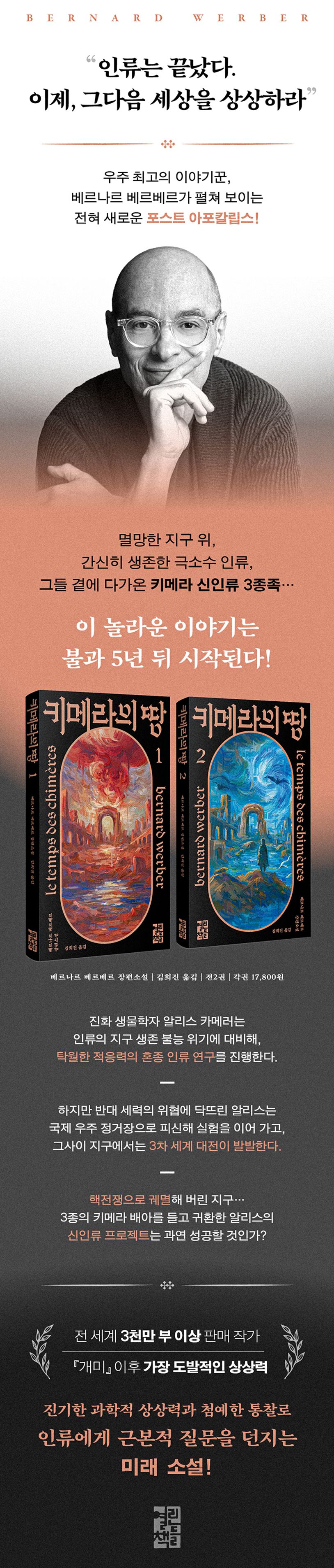 마르지 않는 과학적 상상력으로 무장한 이 시대 최고의 이야기꾼, 베르나르 베르베르가 신작 장편 『키메라의 땅』으로 돌아왔다. 파멸적인 핵전쟁 후 극소수 인간만 생존한 지구. 그곳에 인간과 동물의 혼종 신인류, 에어리얼, 디거, 노틱이 탄생한다. 배타적인 구인류와 탁월한 적응력을 지닌 신인류 3종족의 갈등, 그리고 뒤늦게 등장하는 또 다른 키메라까지……. 멸망한 지구의 새 하늘과 땅과 바다에서, 이들은 어떤 운명을 개척해 나갈 것인가. 인류의 미래에 대한 깊은 통찰력으로 펼쳐 보이는, 전혀 새로운 스타일의 포스트 아포칼립스!