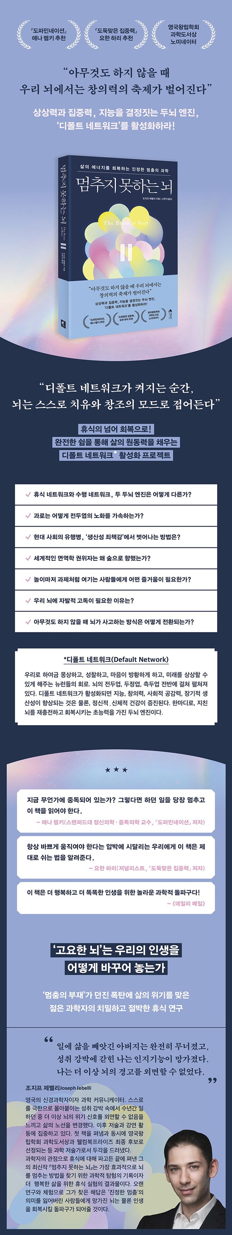 『멈추지 못하는 뇌』는 가장 효과적으로 뇌를 멈추는 방법을 찾기 위한 과학적 탐험의 기록이자 더 행복한 삶을 위한 휴식 실험의 결과물이다. 우리 뇌를 잘 쉬게 할 때, 디폴트 네트워크가 제대로 작동할 때 우리의 인생은 얼마나 윤택하고 건강해질 수 있는가. 이 책은 놀이와 휴식마저 일처럼 계획하고 수행하느라 ‘진정한 멈춤’의 의미를 잃어버린 사람들에게 망가진 뇌는 물론 인생을 회복시킬 돌파구가 되어줄 것이다.
