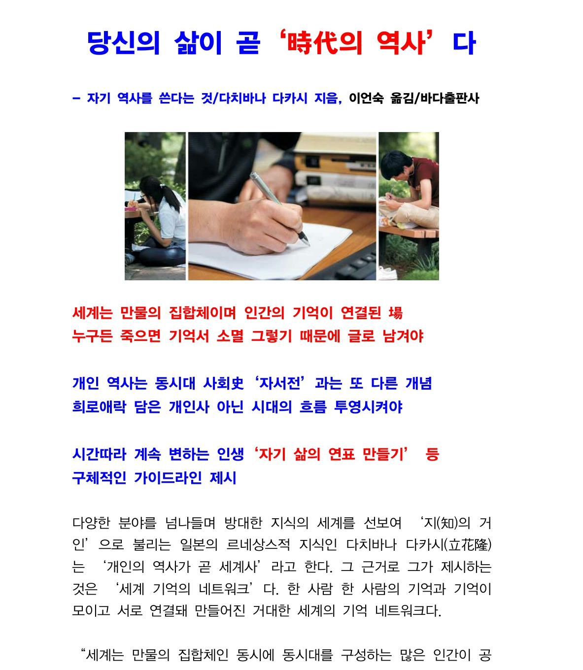 다치바나 다카시는 인생 60이 되면 자기 역사에 관심을 갖게 된다고 말한다. 하지만 한 단계의 인생을 정리하고 다음 단계를 준비하는 것이 자기 역사를 쓰는 이유라면 꼭 60세까지 기다릴 필요는 없다. 지금까지 살아낸 자신의 삶 속에서 다음 단계를 준비하고자 할 경우, 길든 짧든 자신의 삶의 역사를 그 시대의 역사적 사건과 함께 정리해 볼 수 있기 때문이다. 결국 자기 역사를 쓰는 일은 모든 세대를 위한 일이다.