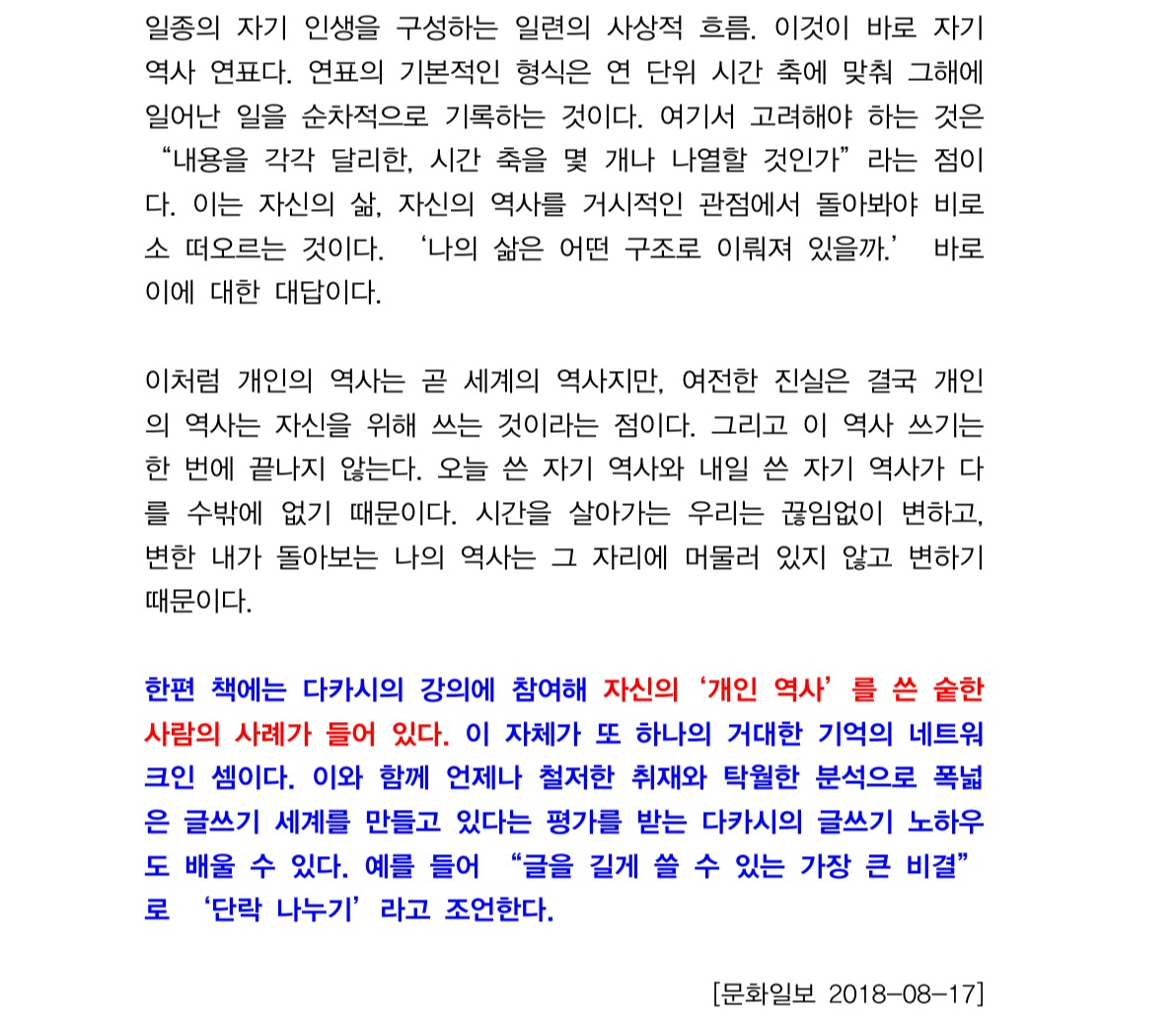 글쓰기가 익숙하지 않은 사람들은 예외 없이 원활하게 단락 나누기를 하지 못할 때가 많다. 다치바나 다카시는 이런 이들에게 “고민할 필요가 없는 것을 고민한다”면서 세계의 역사이기도 한 자기 역사를 주저하지 말고 시작할 것을 권한다. ‘자기 역사’라는, 어쩌면 조금 거창해 보이는 수사에 겁먹을 이유가 없다는 의미인 셈이다.